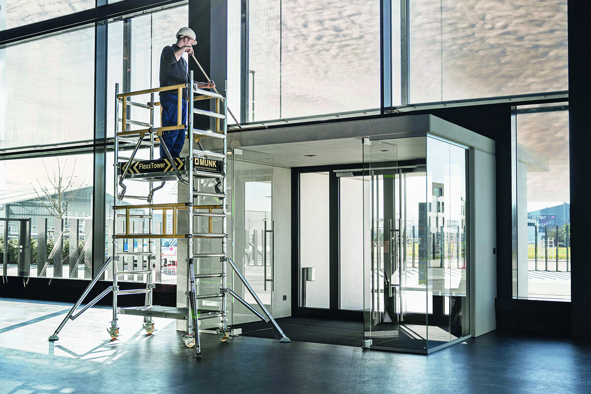 Ebenfalls mit dabei auf der Messe war das beliebte Ein-Personen-Gerüst »FlexxTower«. Mit ihm erreichen Anwender ganz allein und in kürzester Zeit Arbeitshöhen von bis zu 6,10 m. Für maximale Arbeitssicherheit sorgt der »FlexxTower« in der SG-Variante: Er ist mit einem vorlaufenden Sicherungsgeländer ausgestattet und lässt sich ganz einfach von einer Person auf- und abbauen. Der »FlexxTower SG« wurde in das Arbeitsschutz-Prämienprogramm der Berufsgenossenschaft der Bauwirtschaft (BG BAU) aufgenommen. Anwender können so beim Kauf des Ein-Personen-Gerüsts der Munk Günzburger Steigtechnik Zuschüsse erhalten: Die BG BAU übernimmt hier bis zu 50 Prozent der Anschaffungskosten, maximal bis zu 1 500 Euro. Arbeitshöhen von bis zu 4,2 m erreichen Anwender schnell und sicher mit der Kleinsthubarbeitsbühne »FlexxLift«. Sie wird ohne Strom leichtgängig über einen ausgeklügelten Mechanismus angetrieben und lässt sich mobil und völlig ortsunabhängig von einzelnen Personen einsetzen. Als besonderes Highlight präsentierte die Munk Günzburger Steigtechnik auch den neuen Steigleiter-Konfigurator. Er ist der erste Konfigurator der Branche, mit dem Anwender und Planer die eigene Fassade realitätsnah simulieren und ihre perfekte Steigleiter entwerfen können.