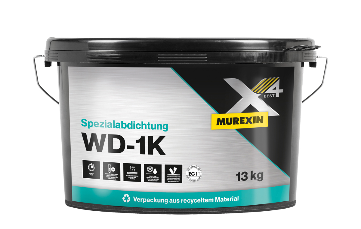 »WD-1K« ist eine Murexin-Spezialabdichtung auf Basis der SMP-Technologie. Silanprodukte können aufgrund ihrer niedrigen Viskosität ohne Lösemittel und ohne Zugabe von Isocyanat hergestellt werden. »WD-1K« ist daher gesundheitlich unbedenklich und bietet weitere zahlreiche Produktvorteile. Dazu zählen eine besonders hohe Wasserdichtigkeit, Temperatur- und UV-Beständigkeit, eine Applikation ohne Vorgrundierung auf Standarduntergründen, aber auch der Beitrag zu mehr Nachhaltigkeit: »WD-1K« ist im wieder geschlossenen Gebinde über Monate weiter verarbeitbar.