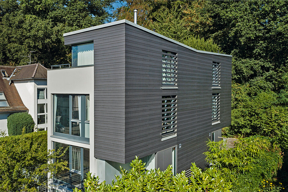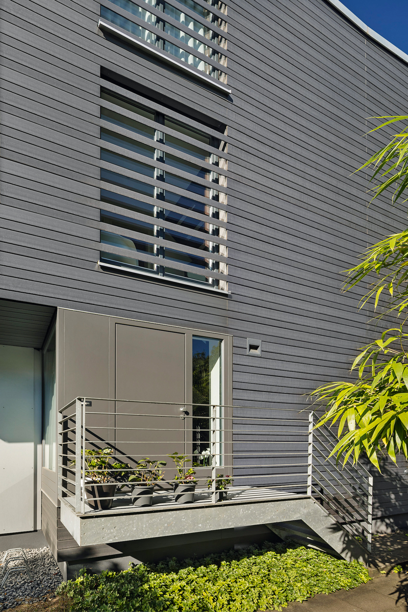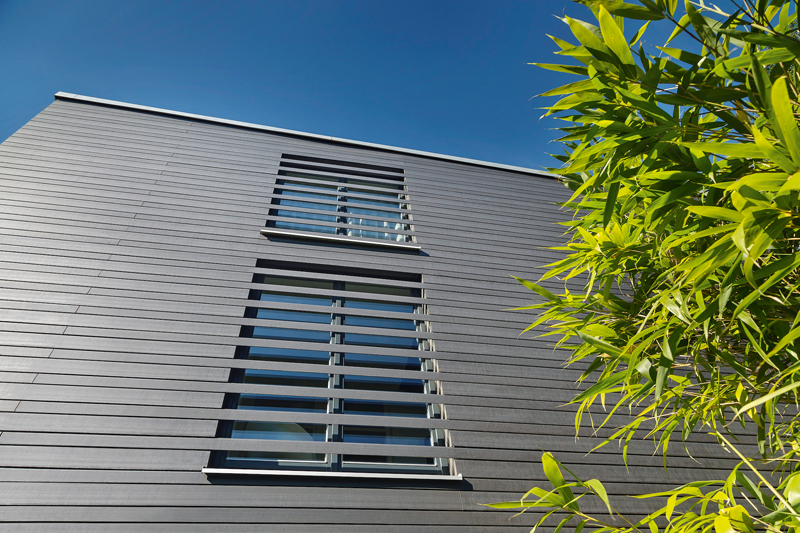 Auf der Suche nach einem hochwertigen, dabei pflegeleichten und zugleich langlebigen Material fiel die Wahl auf ein Fassadensystem aus Holzverbundwerkstoff. »Als Architektin habe ich häufiger mit diesem Material zu tun, wobei es dann vorrangig auf Terrassen, aber immer öfter auch an Fassaden zum Einsatz kommt«, so Dipl.-Ing. Beatrice Korte. Ihrer Ansicht nach sollten die in der Architektur eingesetzten Materialien authentisch, ehrlich umzusetzen sein und ihrer Aufgabe gerecht werden. Als »überzeugte Puristin« – nicht nur was den Baustil anbelangt, sondern auch bei den verwendeten Materialien – hatte sie anfänglich Vorbehalte. »Ich habe mich zunächst mit den Holzverbundwerkstoffen etwas schwergetan, da dies kein originäres Material ist, sondern Holz mit einer, zwar geringen, Kunststoff-Beimischung.« Am Ende jedoch zeigte sie sich von diesem Werkstoff überzeugt, weil das Material die gelungene Kombination aus Nachhaltigkeit, Langlebigkeit, Pflegeleichtigkeit und der hochwertigen Optik gewesen sei, die ausschlaggebend bei der Entscheidungsfindung war.