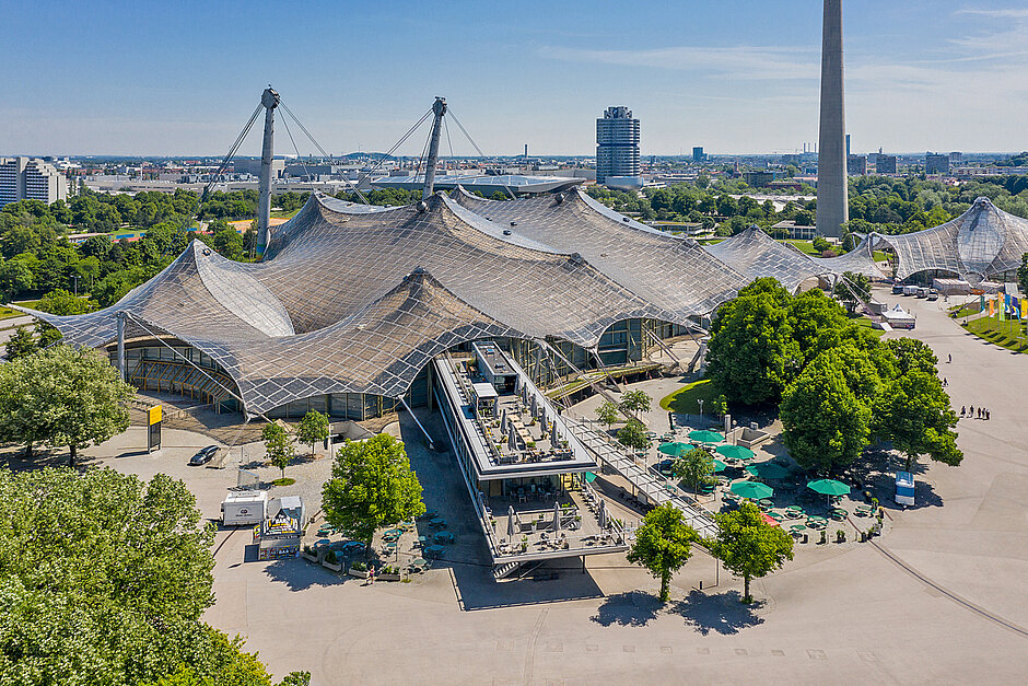 Die Coubertin-Terrassen gehören zum Gebäudekomplex der Olympiahallen und wurden 2011 fertiggestellt. Der »Club Coubertin« erweitert das gastronomische Angebot vor Ort: Mit 500 Sitzplätzen auf zwei Ebenen und einem Biergarten stellt das Coubertin eine echte Bereicherung auf dem Gelände des Olympiaparks dar. Das nachträglich eingefügte Gebäude schiebt sich als Riegel in Stahlskelettbauweise mit Betonkern und -decken unter das Zeltdach in die Olympiahalle. Der bereits nach rund zehn Jahren erneuerungsbedürftige, ursprüngliche Belag aus Robinie musste auf 470 m2 ausgetauscht werden. Im Zuge der Maßnahme sollten auch die ortsfesten Schirmständer für die Sonnenschirme integriert werden. Deshalb beauftragten die Stadtwerke München das für den ursprünglichen Coubertin-Bau beauftragte Architekturbüro Auer Weber mit der Planung. Doch schon bald nach Planungsbeginn im Oktober 2019 zeigte sich, dass die Aufgabe komplexer war als erwartet: Es galt, viele Interessen – so zum Beispiel Denkmalschutz, Urheberrecht, Nutzung im öffentlichen Raum, Tragverhalten, Anforderungen des Betreibers, Anforderungen an die Sicherheit, aber vor allem die Vorgaben an das Material und seine Farbgebung bzw. sein Farbverhalten – miteinander zu vereinen. Um das beste Material zu finden, das den zahlreichen und anspruchsvollen Anforderungen gerecht wurde, führte der Bauherr in Zusammenarbeit mit dem Architekturbüro eine ausführliche Bemusterung von Dielen aus diversen Hölzern und Holzverbundstoffen durch.