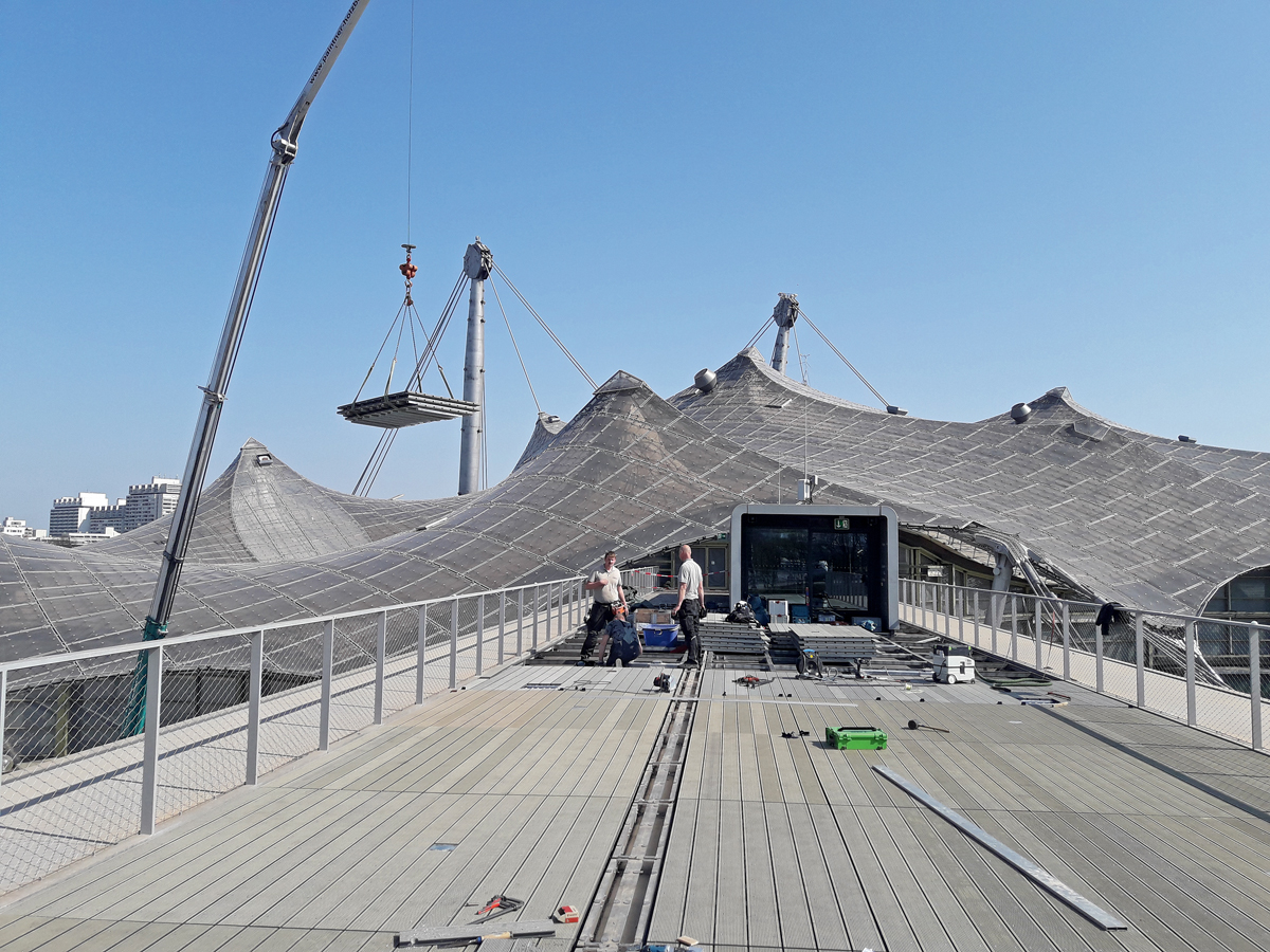 Der Zuschlag für die Ausführung wurde der Firma Paintner Holzbau aus Ergolding erteilt. Damit kam ein in mehrfacher Hinsicht sportliches Projekt auf die erfahrenen Holzbauer zu: Durch die Ukraine-Krise und die Nachwehen der Pandemie war mit Lieferengpässen zu rechnen. Doch auch die projektbezogenen Bedingungen waren knifflig, da nun wieder Veranstaltungen in der Olympiahalle stattfanden und die Arbeitsflächen rund um die Coubertin-Terrassen als notwendige Fluchtwege dienen. Das bedeutete, dass bei anstehenden Veranstaltungen die Baustelle – teilweise auch mehrere Tage hintereinander – ruhen musste. Der Auftragnehmer war, um dem engen Zeitrahmen gerecht zu werden, gefordert, eine Lösung zu finden, damit der Austausch des Belags in minimaler Montagezeit vonstattengehen konnte.