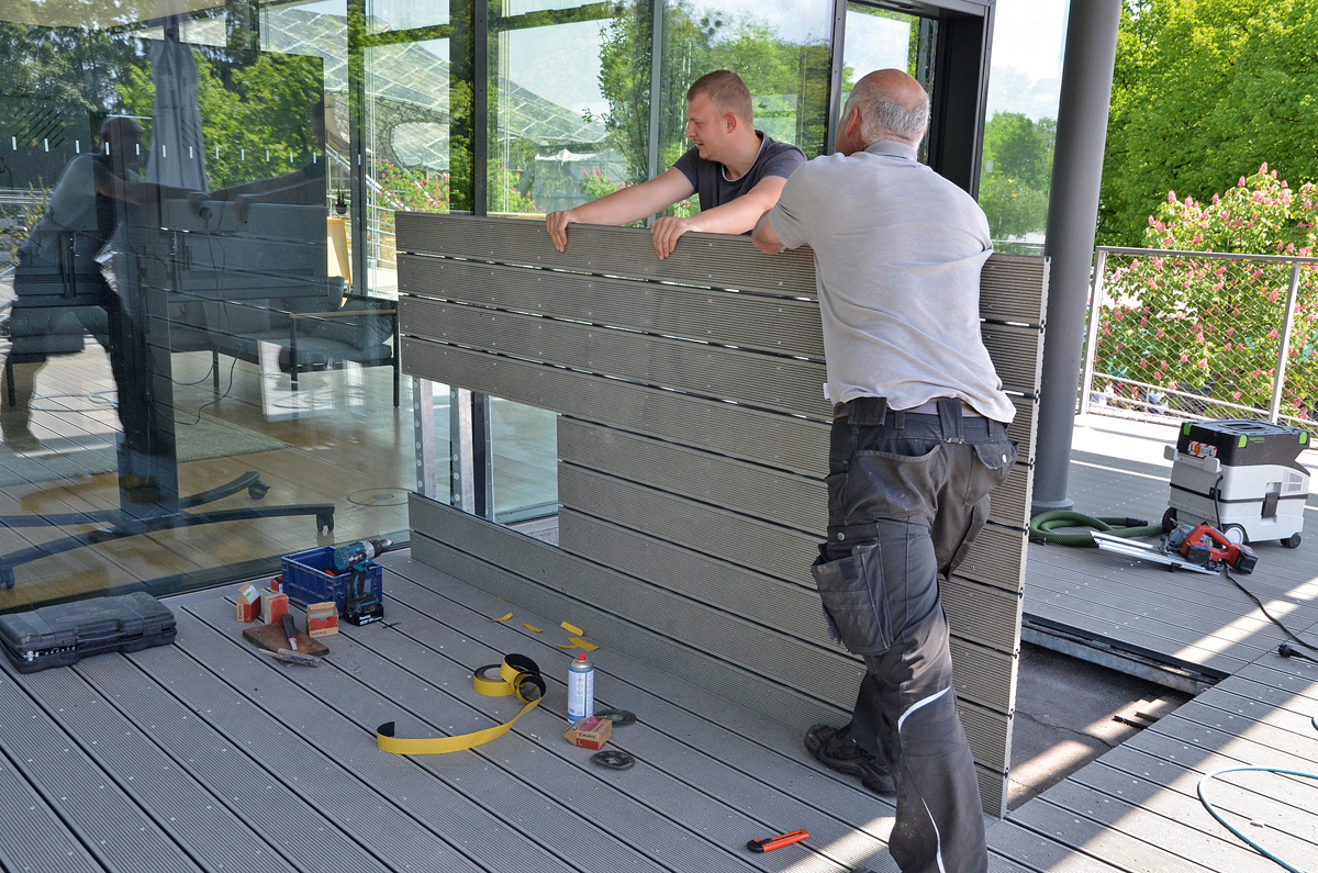 Im Juli 2021 wurden von den Beteiligten drei Musterflächen vor Ort angelegt, die in den folgenden Wochen unter realen Bedingungen bewittert und strapaziert wurden. Neben mechanischen, chemischen, biologischen und physischen »Stress-Tests« wurde aufgrund der gastronomischen Nutzung mit dem Kontakt von Wein, Ketchup, Öl und Kaffee auf den Materialien experimentiert. Nach Beendigung des dreimonatigen Tests fiel die Wahl auf die Terrassendiele »Die Beliebte massiv« in Steingrau, eine Holzverbundwerkstoff-Diele von Naturinform im Vollprofil. Das Material konnte alle Anforderungen erfüllen: Nahezu verwindungsfrei und extrem pflegeleicht ist die Terrassendiele äußerst robust gegen mechanische und chemische Einwirkungen. Aufgrund der Materialzusammensetzung versprechen die Dielen eine hohe Langlebigkeit, splittern nicht und sind somit auch barfußtauglich. Die gefordert hohe Rutschhemmung konnte mit R13 auf beiden Seiten zudem erfüllt werden. Weiterhin war es den Architekten sehr wichtig, dass die Farbgebung dem vergrauten Robinien-Belag entsprach, was mit der Terrassendiele in Steingrau auch nach dreimonatiger Verwitterung gegeben war.