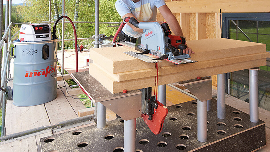 Mit leistungsstarkem Volumensauger und portablem Sägetisch möchte Mafell ein neues Seilsäge-System anbieten, welches zuverlässig arbeitet, sicher ist und auch wirtschaftliches Bearbeiten von Dämmstoffplatten ermöglicht. Die Platten, vor allem mit großen Dicken, waren laut Hersteller bislang mit herkömmlichen Handsägen, Handbandsägen, Kettensägen, Kreissägen, Wellenschliffmessern und selbst mit speziellen Sägesystemen nur mit großem Aufwand zu bearbeiten. Zudem wurde das Arbeiten auf dem Gerüst oder Dach erschwert oder das Schnittbild war nicht optimal. Eine unpräzise Schnittfuge erzeugt allerdings eine Kältebrücke, die zur Bildung von Kondenswasser und damit zum Eintrag von Feuchtigkeit und gar zur Bildung von Schimmel führen kann. Das Zusammenwirken von Sägeseil, dem biegesteifen Carbon-Führungskeil und einem Sägetisch ermöglicht selbst auf dem Gerüst eine Schnittqualität, die keine Kältebrücken entstehen lässt. Das nachträgliche Verfüllen von Schnittfugen wird dadurch ebenso vehindert.