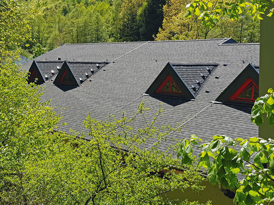 Seitens der Bauabteilung von Daaden-Herdorf wurde vorgegeben, dass die neue Dacheindeckung auf einer geschlossenen Unterkonstruktion aufliegen sollte. Man entschied sich hier für eine abgelagerte Holzschalung. Auf diese brachten die Dachdecker als sichere Vordeckbahn eine »Armourbase Pro Plus« mit selbstklebenden Überdeckungen auf. Da die Anforderungen an das Material jedoch nicht nur in der Dachfläche bestanden, sonders ganz besonders in den vielen Detaillösungen – wie Gauben und Kehlen, Fensteranschlüsse, aneinanderstoßende Gebäudeteile und Dachflächen auf unterschiedlichen Höhen und einer durchgängigen Be- und Entlüftung – fiel die Wahl auf das IKO-Komplettprogramm zur Lösung dieser Aufgabenstellung.