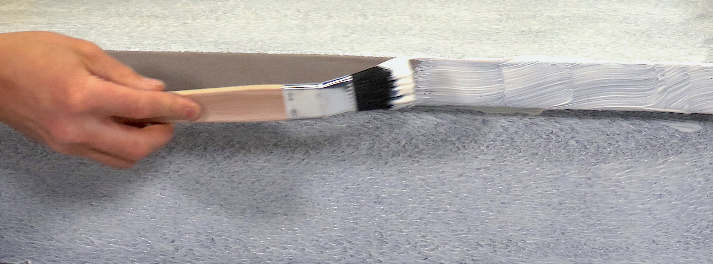 Praktisch für den Baustellenablauf: Der Belag kann bereits am Vortag mit ARDEX AF 635 eingestrichen und dann zwischengelagert werden. „Nach dem Einlegen kann der Belag noch korrigiert werden. Die Verfilmung der Klebstoffschichten beginnt erst nach dem Anpressen“, erläutert Martin Kupka. Dazu werden die Klebstoffschichten mit kurzem, hohen Druck aufeinandergepresst – der Klebstoff haftet dann unmittelbar. Der Klebstoff trocknet geruchsneutral aus und ist weichmacherbeständig.