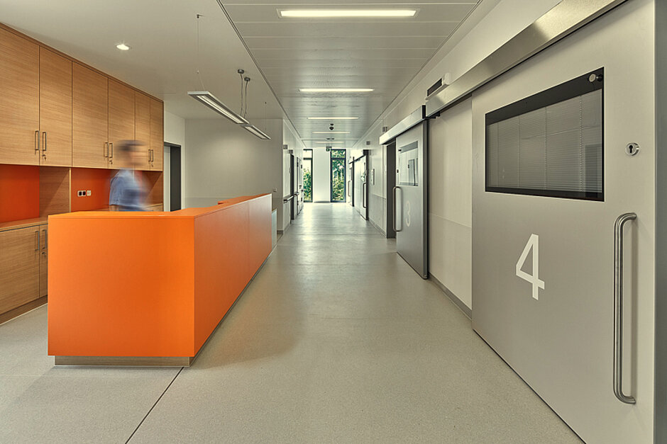 Im zweigeschossigen, kompakten Neubau mit diversen Funktionsräumen (Labore, OP-Säle, Behandlungszimmer, Sanitärbereiche und Verwaltung) wurden insgesamt 35 manuell zu bedienende oder automatische Spezial-Schiebetüren »sonor-slide« in unterschiedlichen Größen verbaut – schnelles Betreten und rasche Ortswechsel inklusive. Die ca. 230 Drehtüren kamen in diversen Varianten zum Einsatz: Ob verschiedene Stahlzargen, Türen mit Plano-Verglasung oder mit innenliegender Jalousie – alle Türen wurden auf optimale Arbeitsabläufe sowie auf eine diskrete, besonders komfortable Patientenbehandlung abgestimmt. Die Feucht- und Nassräume wurden selbstverständlich ebenfalls mit speziellen Türelementen ausgestattet.