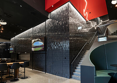 Ein architektonisches und technisches Highlight ist der »Porsche Tunnel Club« – ein exklusiver Bereich tief im Inneren der Haupttribüne, umgeben von Spielertrakt, Servicezonen und ausgestattet mit großflächigen LED-Bildschirmen. Hier tauchen Gäste direkt in die Atmosphäre eines Spieltages ein – begleitet von modernster Technik und erstklassiger Gastronomie. Auch in diesem Umfeld setzt Neuformtür Akzente: großformatige Türelemente mit spezialveredelten Oberflächen aus Metall oder keramischen Fliesen bilden markante Zugänge . Gleichzeitig erfüllen sie höchste Anforderungen an Hygiene, Diskretion und Schutz.