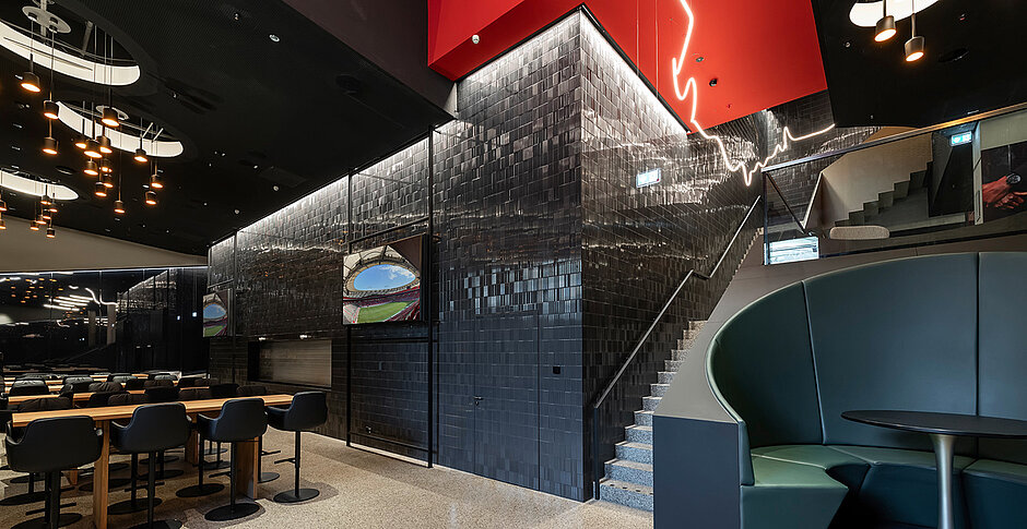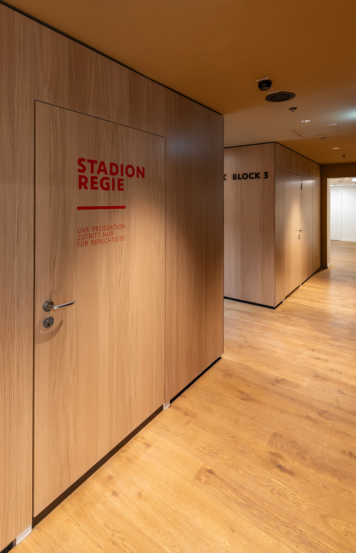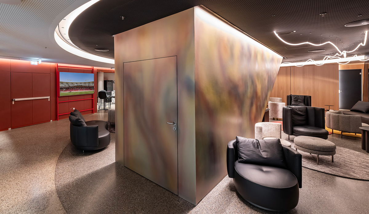 Ein architektonisches und technisches Highlight ist der »Porsche Tunnel Club« – ein exklusiver Bereich tief im Inneren der Haupttribüne, umgeben von Spielertrakt, Servicezonen und ausgestattet mit großflächigen LED-Bildschirmen. Hier tauchen Gäste direkt in die Atmosphäre eines Spieltages ein – begleitet von modernster Technik und erstklassiger Gastronomie. Auch in diesem Umfeld setzt Neuformtür Akzente: Großformatige Türelemente mit spezialveredelten Oberflächen aus Metall oder keramischen Fliesen bilden markante Zugänge. Gleichzeitig erfüllen sie höchste Anforderungen an Hygiene, Diskretion und Schutz.