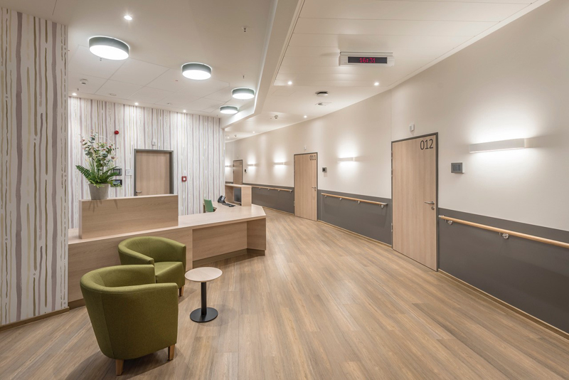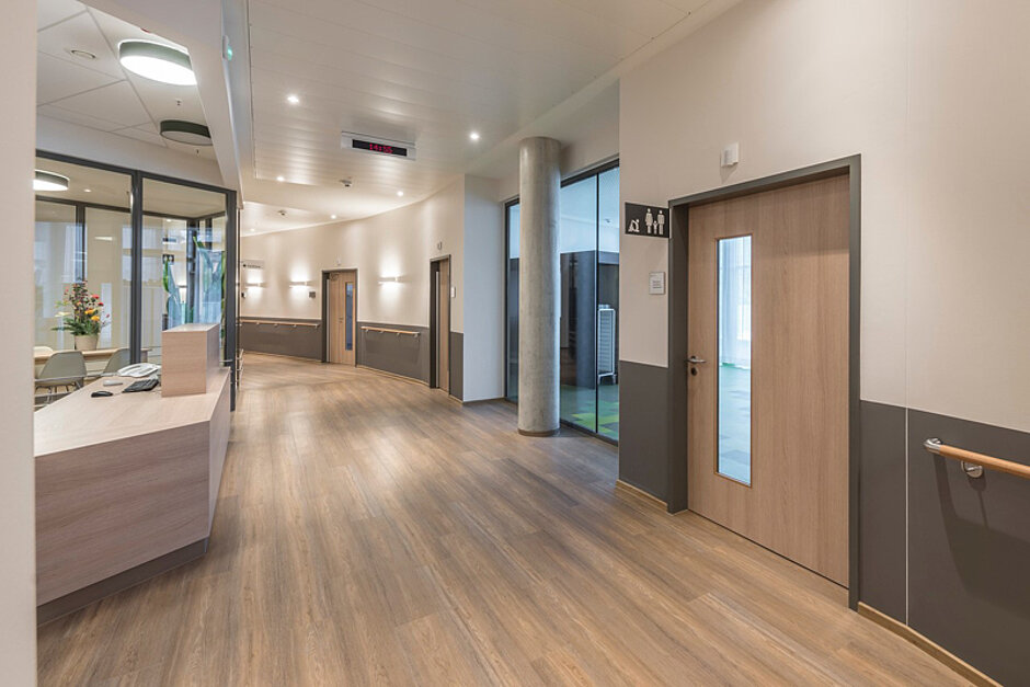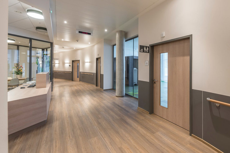 Die allesamt wohnlich anmutenden und Sicherheit versprechenden Objekttüren öffnen die Patientenzimmer sowie die Patientenbäder. Zweiflügelige Türelemente führen zu den Material-Depots und Brandschutztüren zu Funktions- und Technikräumen. Entsprechend des Einsatzgebietes sind die Türelemente extra breit, mit Schall- und / oder Brandschutz ausgestattet oder als Schiebetüren für einen barrierefreien Zugang angelegt.