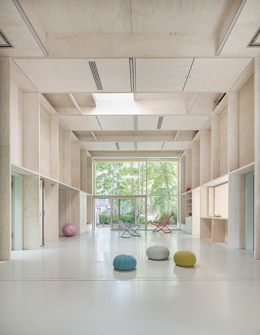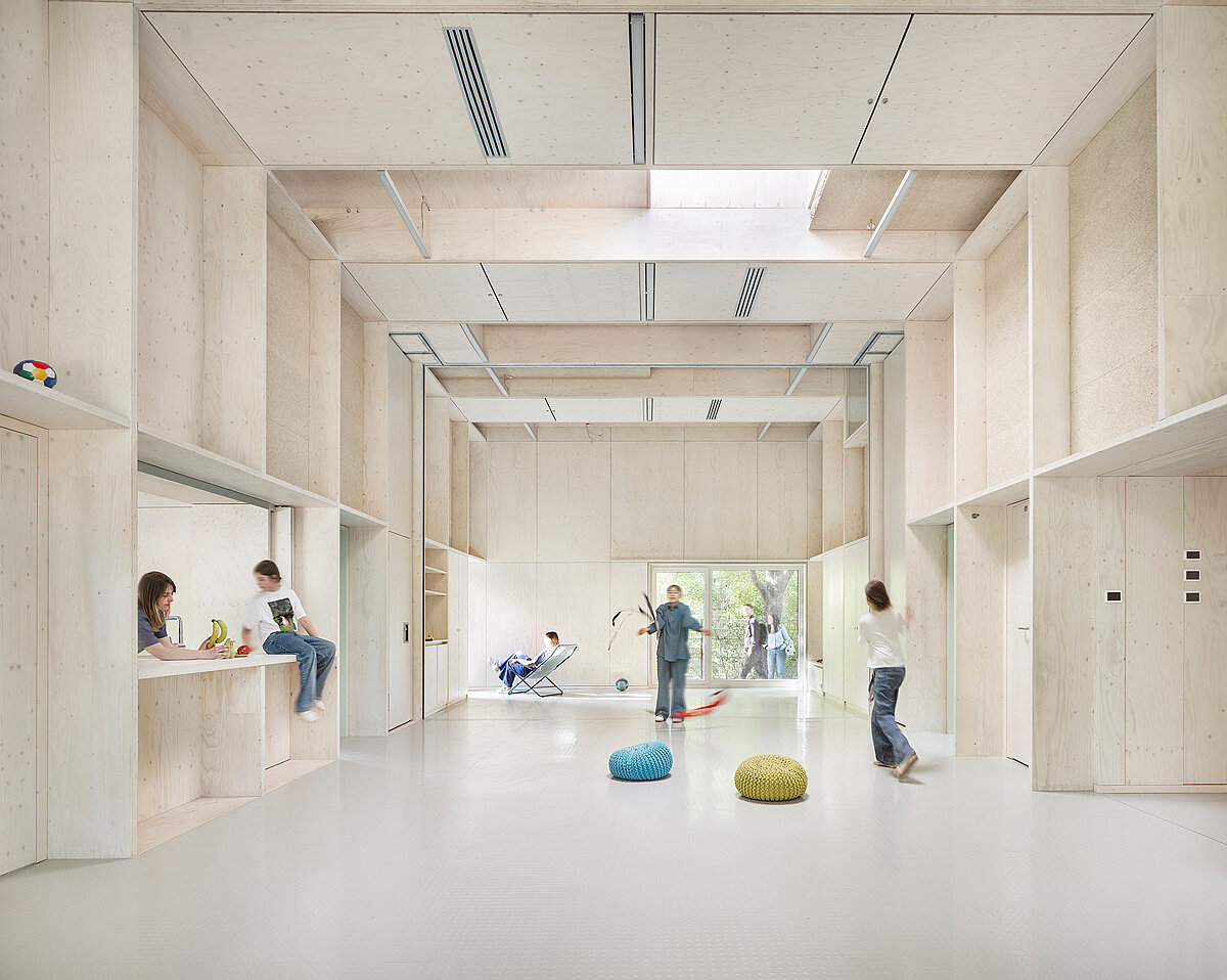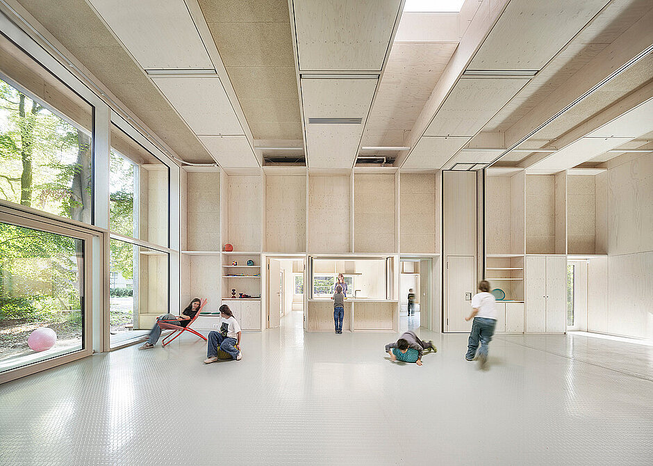 Der im Oktober 2025 eröffnete Moabiter Kinderhof in Berlin versteht sich als offenes Haus für den Alltag von Kindern und Jugendlichen im dicht bebauten Stadtraum. Kersten Kopp Architekten reagierten auf den besonderen Ort zwischen Park und Quartier mit einem Gebäudeensemble, das aus mehreren, an Spielklötze erinnernden Kuben besteht und sich harmonisch in den gewachsenen Baumbestand schiebt. Der Neubau wurde in Holzbauweise realisiert; sein Tragwerk setzt sich aus vorgefertigten Modulen zusammen, die im Werk produziert und auf der Baustelle montiert wurden. Die Architektur wird dabei als Rahmen für Offenheit, Partizipation und Orientierung verstanden. Dieses Leitprinzip setzt sich konsequent in der Materialwahl fort: In den Innenräumen bildet der Noppenbelag »norament 926« das passende Fundament für das ständige Rein und Raus der Kinder zwischen Spielhof und Haus.