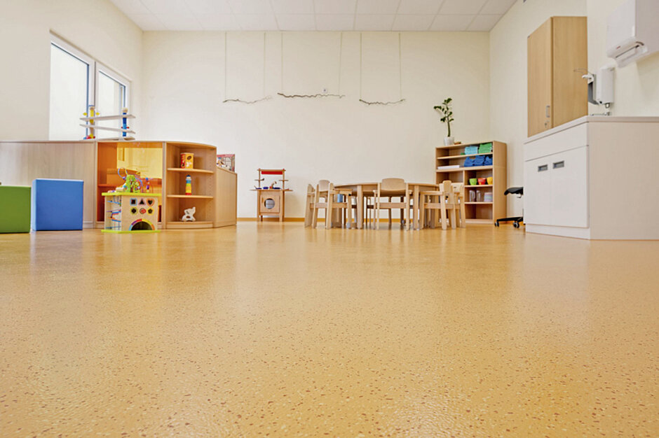 In der klar gegliederten, lichtdurchfluteten Kita werden schon die Flure und Erschließungswege zu erlebnisreichen Spiel- und Bewegungsflächen. Auf dem rutschfesten und dauerelastischen »norament grano« können die Kleinen gefahrlos rennen und toben. Zugleich lädt der fußwarme Kautschuk-Belag zum Sitzen auf dem Boden ein und ist somit gerade für Krabbelkinder der ideale Untergrund.