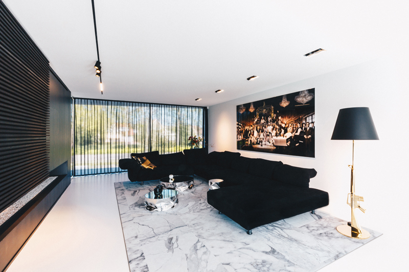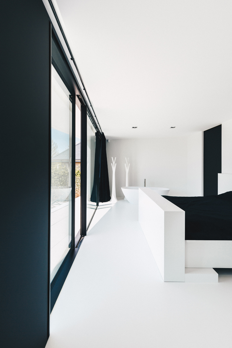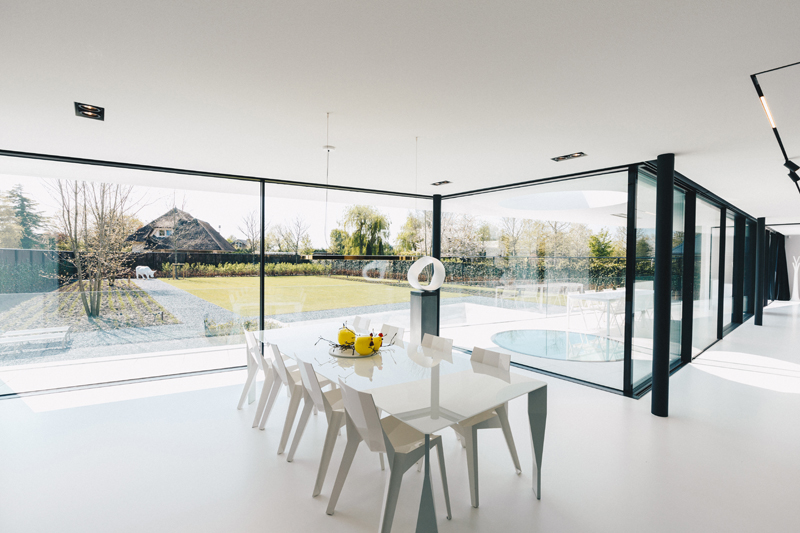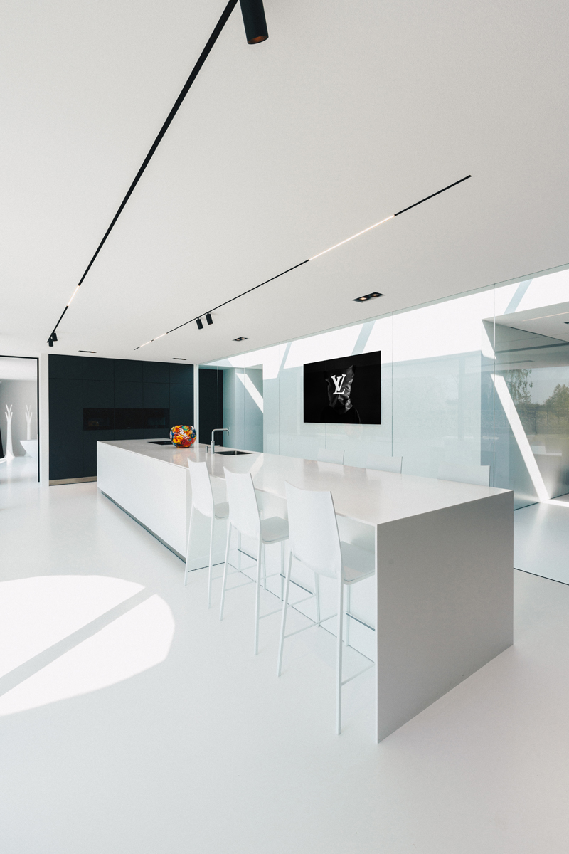 Entworfen wurde das zeitlos elegante Gebäude von Lab32 Architects. Der Entwurf der Architekten ist auf die besonderen Anforderungen und Präferenzen der Bewohner individuell ausgerichtet. Von außen betrachtet integriert das Domizil weiße und gläserne Flächen in ein klassisch-zeitgemäßes Gesamtkonzept. Die formal reduzierten, hell und elegant eingerichteten Innenräume sorgen für ein offenes Raumgefühl, die wandflächig großen Fensterfronten eröffnen großzügige Aus- und Einblicke.