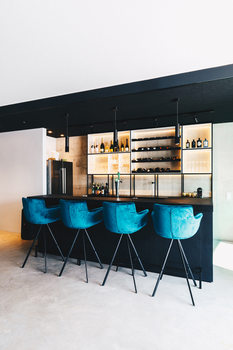 Der zeitlose Stil sollte sich darüber hinaus mit einem hohen Grad an Nachhaltigkeit zu einem »lebendigen Bau« verbinden. Erreicht wurde dies über eine substanziell hohe Bauqualität sowie eine auf den jeweiligen funktionalen Charakter gezielt ausgerichtete Auswahl nachhaltiger Baumaterialien. Die angestrebt hohe »Behaglichkeit« der räumlichen Atmosphäre durfte sich diesen Anforderungen jedoch keinesfalls unterordnen. Dass die Eigentümer Wert auf einen hohen Wohnwert legen, zeigt sich insbesondere in der Gestaltung des Untergeschosses. Dort befindet sich ein Lounge-Bereich mit Bar und Whirlpool. Da die Bauherren in diesem Haus ihren Lebensabend zu verbringen planen, sollte das Gebäude auf pragmatische Weise altersgerecht ausgerichtet sein. Sämtliche Wohnräume befinden sind im Erdgeschoss, in den Keller gibt es einen Lift. Um den besonders hohen Anforderungen an einen nachhaltigen Betrieb gerecht zu werden, wurde das Gebäude weitestgehend energieneutral ausgelegt.