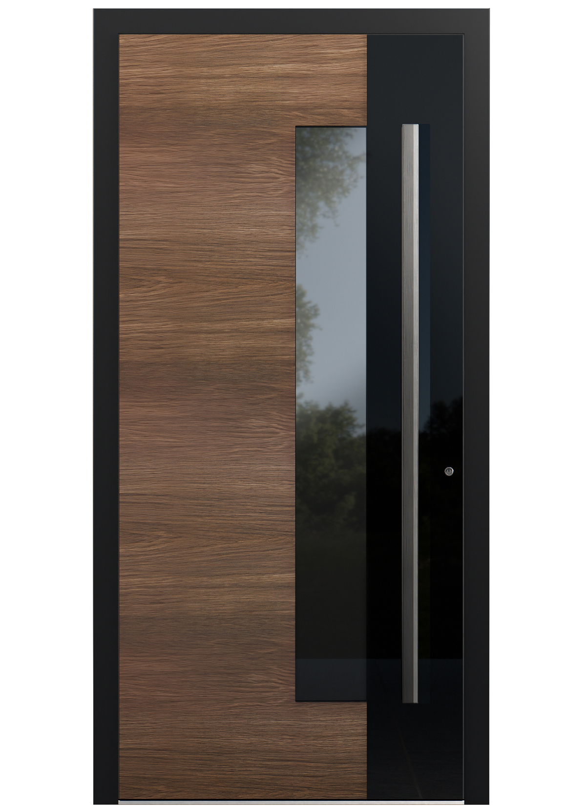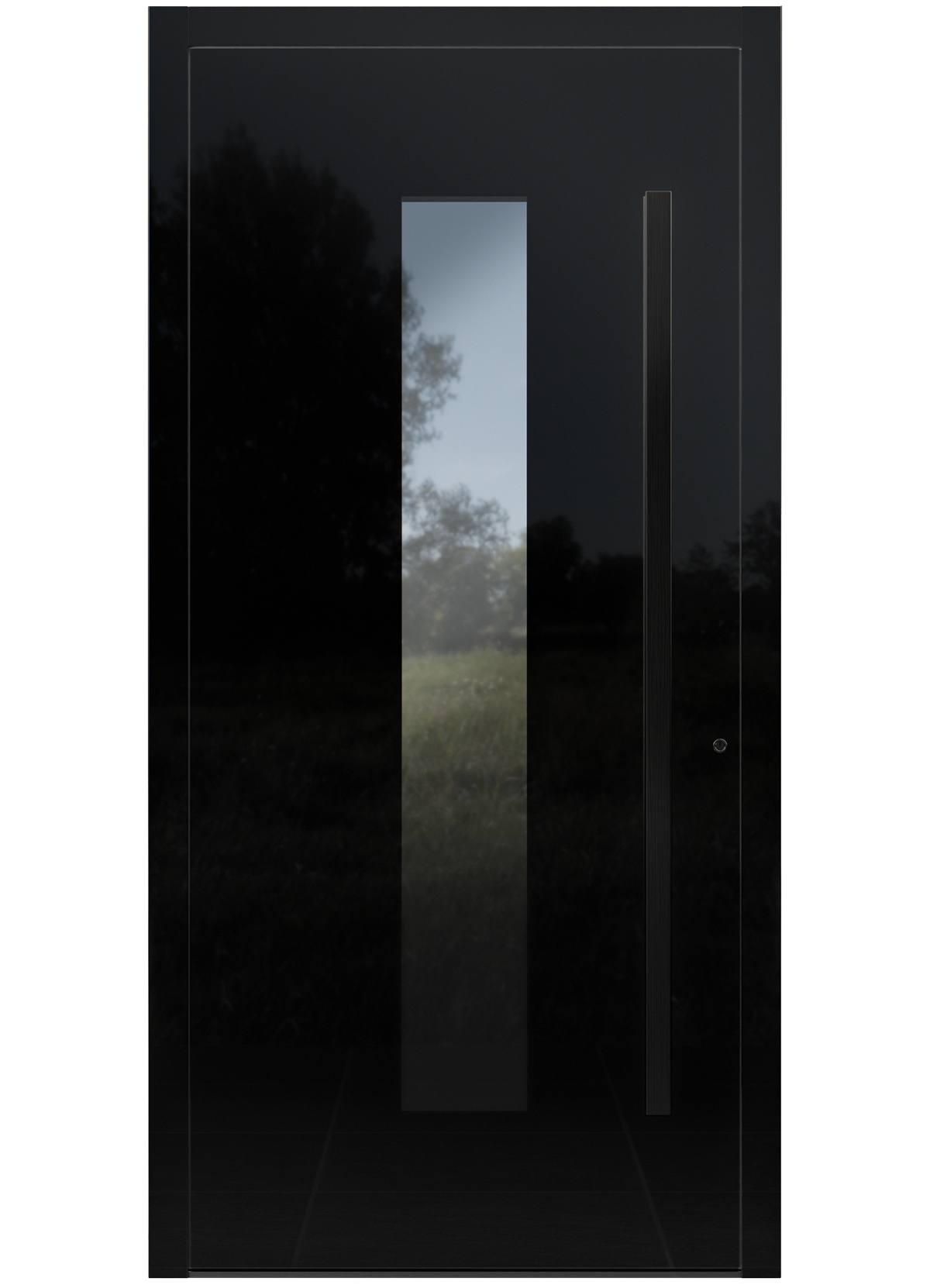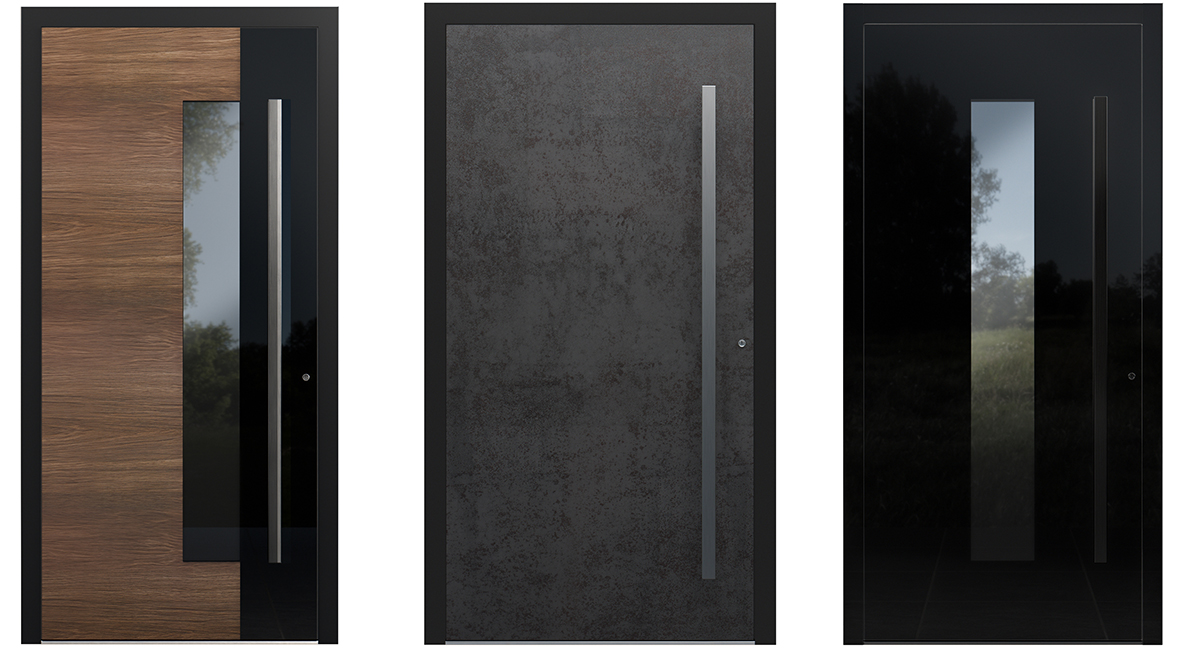 Die drei Füllungslinien zeichnen sich durch unterschiedliche Kriterien aus: Die »Crystal«-Linie bietet elegante Füllungen mit hochwertigem 6-mm-ESG-Glas, das auf das Alupaneel aufgebracht wird. Je nach Modell lässt sich zwischen einer glatten Oberfläche oder waagerechten Fräsungen, immer in der Farbe »RAL 9005 Tiefschwarz«, wählen. Ein bündig eingefasster ESG-Streifen im Blendrahmen rundet die Glasoptik ab. Die großflächigen Glaseinsätze der Linie legen sich wie eine schimmernde Oberfläche über das Türblatt. Hochwertiges ESG-Glas in unterschiedlichen Ausführungen unterstreicht die klare, geradlinige Formsprache. Die Türen wirken leicht und repräsentativ. Sie sind eine gute Wahl für Kunden, die einen modernen und lichtdurchfluteten Eingangsbereich wünschen.