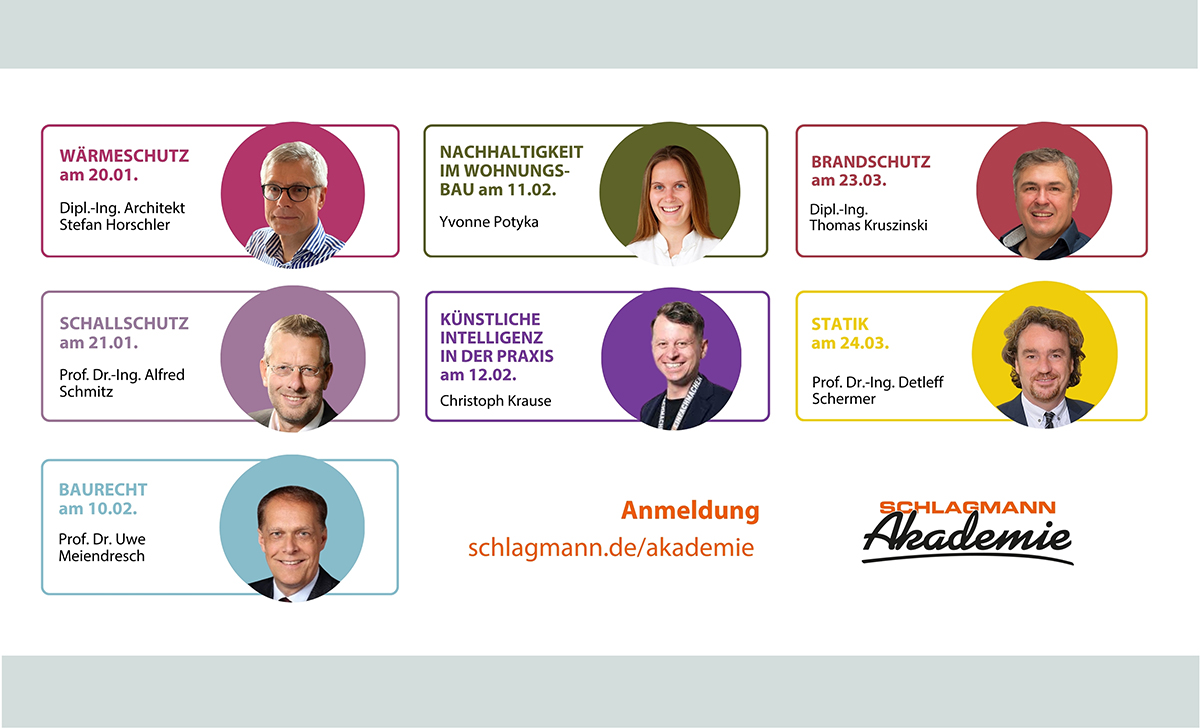 Wie können wir die Baubranche gemeinsam zukunftsfähig gestalten? Dieser Frage widmet sich die neue Saison der Schlagmann Akademie. Im Frühjahr 2026 stehen wieder Live-Streams an, die in dieser Saison erstmals auch das Thema Künstliche Intelligenz in der Baubranche behandeln. Wie gewohnt können die Teilnehmer wieder zahlreiche Fortbildungspunkte sammeln. In den Live-Streams sprechen hochkarätige Referenten zu den Themen Wärmeschutz, Schallschutz, Baurecht, Nachhaltigkeit,