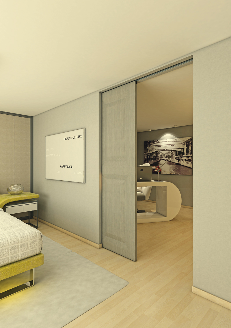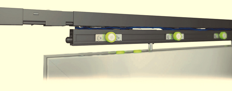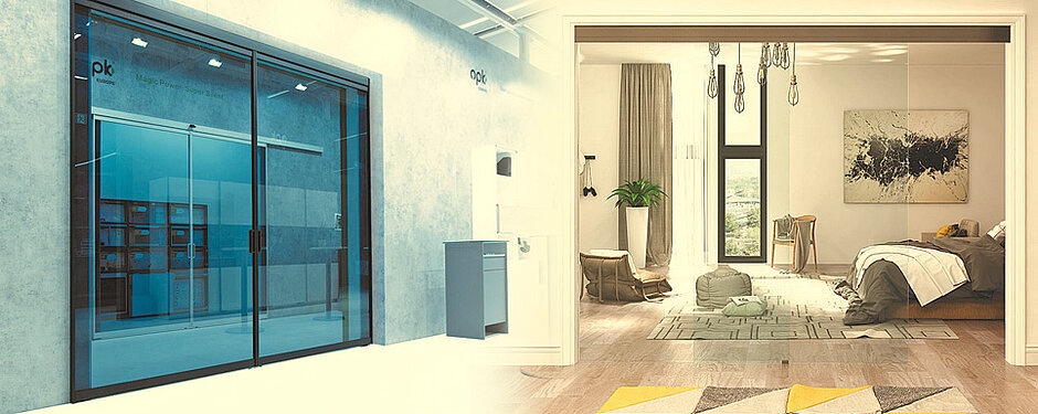Ein Beispiel für den hohen Anspruch, den OPK an seine Produkte stellt, ist der neue Schiebetür-Magnetantrieb »E-Space«. Der Antrieb wird als Single- oder Synchron-Anlage an der Decke montiert und läuft in einem schlanken Aluprofil. »E-Space« ist für Türblätter mit einem Gewicht bis 100 kg ausgelegt. Durchgangsbreiten von 750 mm (einflügelig) bis 3 400 mm (doppelflügelig) können mit dem Magnetantrieb in Kombination mit den entsprechenden Schiebetüren geschlossen werden. Er verfügt über kugelgelagerte Kunststoffrollen, die einen sanften, leisen und praktisch wartungsfreien Lauf versprechen. »E-Space« kann in Kombination mit Holz, Glas und Rahmentüren verwendet werden. Der Beschlag, der benötigt wird, um die Schiebetür(en) mit dem Antrieb zu verbinden, ist im Lieferumfang enthalten. Ebenso eine kugelgelagerte Bodenführung für Holztüren und Glasklemmbeschläge für 8 bis 10 mm dicke Ganzglastüren sowie eine spezielle Bodenführung.