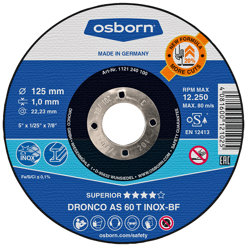 Osborn hat seine millionenfach verkaufte Trennscheibe verbessert. Für die »AS 60 T-INOX ›New Formula‹« haben die Entwicklungsingenieure der Osborn Tochtergesellschaft Dronco am bayerischen Produktionsstandort eine optimierte Rezeptur der Kunstharz-Bindung mit einem Schleifkorn der jüngsten Generation zum Einsatz gebracht. Das Ergebnis laut Osborn: ein Leistungsplus mit einer Steigerung der Standzeit um 20 Prozent. Die »AS 60 T-INOX« aus deutscher Hightech-Produktion kombiniert laut Hersteller eine hohe Schnittgeschwindigkeit mit einer gesteigerten Standzeit. Hinzu kommen alle Eigenschaften, welche die bisherige »AS 60 T-INOX« schon vorher ausgezeichnet haben. Ein millimetergenauer Schnitt bei minimalem Kraftaufwand verspricht eine schnelle Bearbeitung sowie wenig Materialverschleiß. Zusätzlich wird laut Osborn durch die Vermeidung einer thermischen Blauverfärbung sowie durch gratarme bis gratfreie Schnittkanten die Nachbearbeitung des Werkstücks für den Anwender deutlich reduziert.