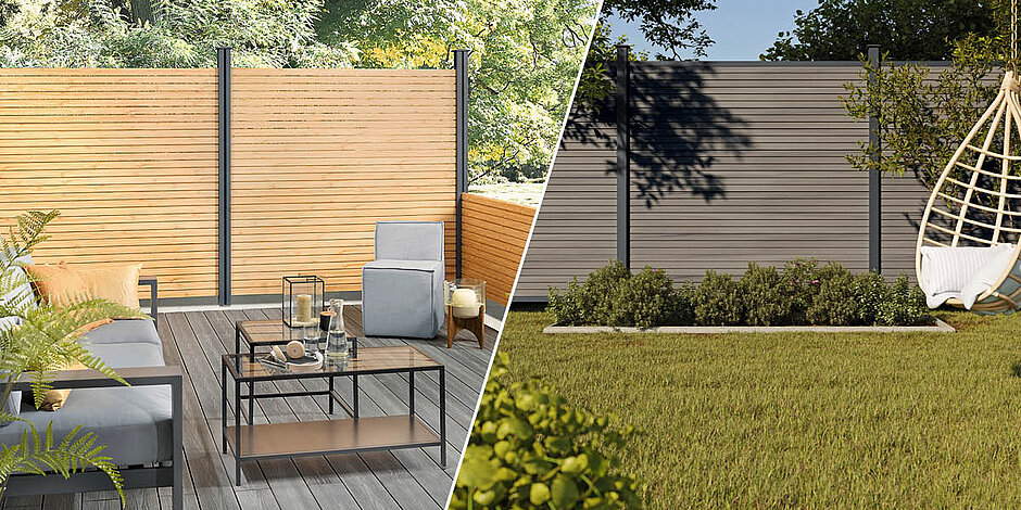 Im ersten Schritt müssen Form und Maße des Grundrisses festgelegt werden. Hier ist alles möglich: die einfache Abgrenzung zum Nachbargrundstück, die klassische L- und U-Form sowie eine komplett freie Konfiguration mit individueller Sonderform. Sind Gefälle oder Steigungen auf dem Grundstück vorhanden, kann die bestehende Veränderung des Geländeniveaus mit angegeben und die Höhe einzelner Sichtschutzelemente entsprechend angepasst werden. Gerade bei Häusern mit Hanglage ist dies ein wichtiges Detail, um ein homogenes Gesamtbild erzielen zu können. Das Herzstück der Konfiguration bildet die Wahl der gewünschten Sichtblenden.