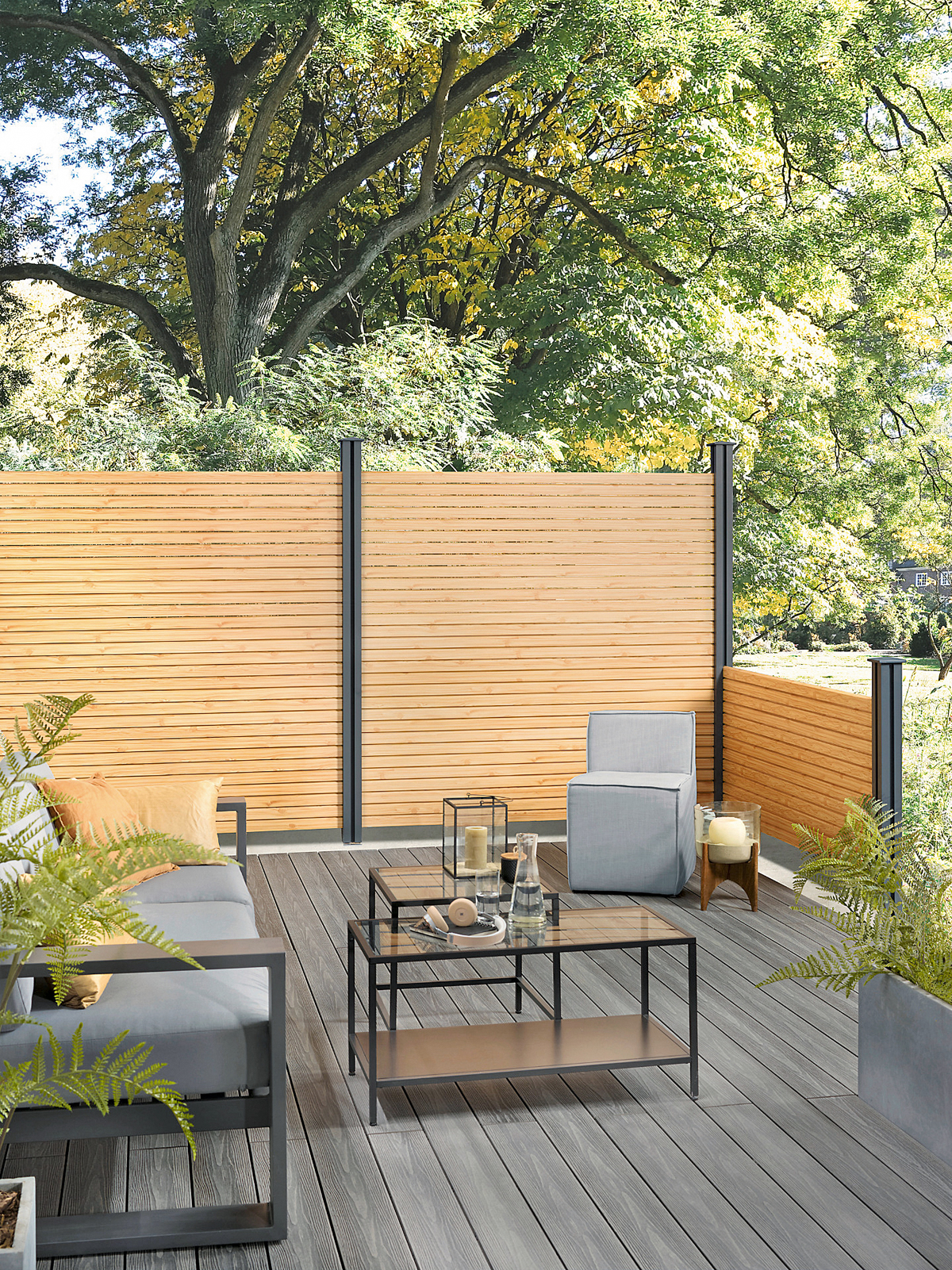 Osmo bietet ein breites Sortiment aus Holz-, Aluminium-, BPC- und Glas-Elementen für persönliche Gestaltungskonzepte an. Zur Erweiterung des kreativen Spielraums können die verschiedenen Elemente beliebig miteinander kombiniert werden. So kann beispielsweise die Verbindung von ursprünglichem Holz mit modernen Elementen aus Aluminium ausdrucksstarke Designwelten schaffen. Während Holz im Außenbereich vor allem durch seine natürliche Optik und Haptik beeindruckt, erfreut sich Aluminium dank seiner extremen Witterungsresistenz und Robustheit bei gleichzeitig geringem Gewicht großer Beliebtheit. Wer auf eine pflegeleichte Holz-Alternative aus Bambus-Verbundstoffen zurückgreifen möchte, setzt auf Sichtschutzsysteme aus BPC wie die neue »Multi-Fence Cube«-Sichtblende in den drei Trendfarben Greystone, Silvergrey und Lightbrown. Abwechslung und zeitgemäße Akzente können auch durch die Integration von Glasscheiben realisiert werden. Sie sorgen für Transparenz, schützen aber dennoch die Privatsphäre und schaffen ein zeitlos-elegantes Ambiente. Komplettiert wird die Konfigurationsvielfalt durch verschiedene Pfosten, passende Pfostenanker und Pfostenkappen.