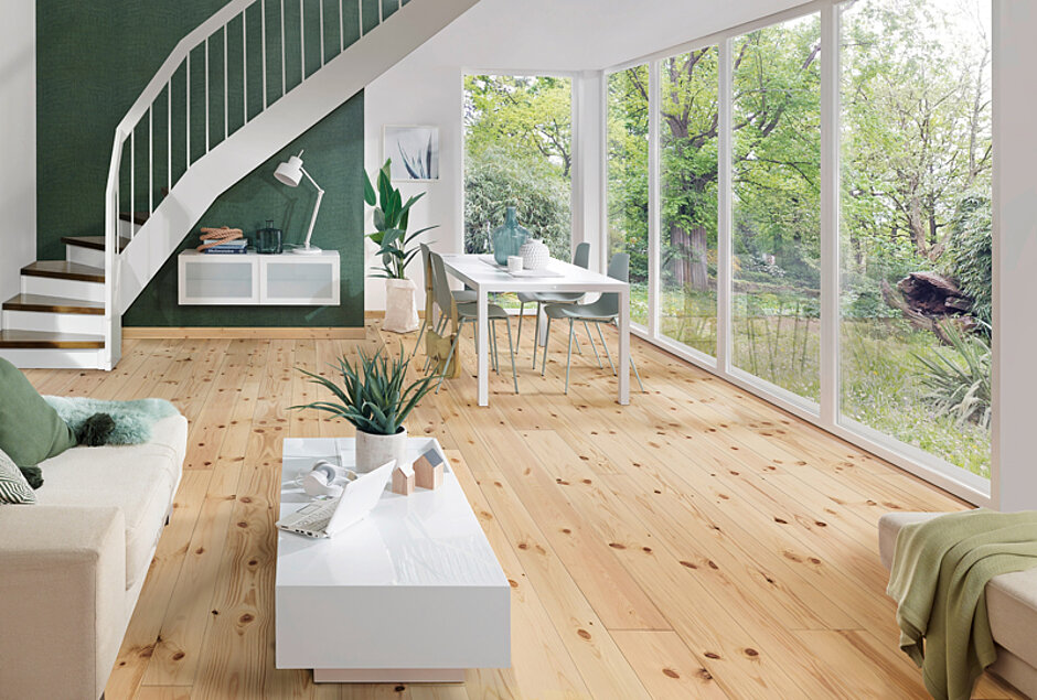Das Holz kann weiter „atmen“ und Feuchtigkeit aus der Raumluft aufnehmen und auch wieder abgeben. Im Vergleich zu Mehrschichtparkett erfordert die Produktion von Massivholzdielen nach Aussage von Osmo weniger Energie und Ressourcen. Durch die Verwendung heimischer Hölzer aus nachhaltiger Forstwirtschaft sind zudem die Transportwege überschaubar und vermindern den Ausstoß schädlicher CO2-Emissionen. J