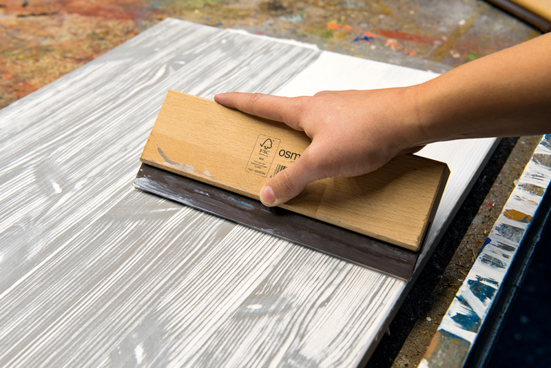 Ganz besondere Effekte erzielt die Duo-Ton-Technik auf strukturierten Holzoberflächen: Ein zweifarbiger Anstrich bringt die Struktur voll zur Geltung. Im ersten Schritt wird eine dünne Schicht Osmo »Dekorwachs« im Wunschfarbton aufgetragen. Nach mindestens 24 Stunden Trocknungszeit ist das Holz bereit für den zweiten Anstrich in einem anderen Farbton. Nachdem Auftrag muss der Anstrich, solange er noch nass ist, wieder abgezogen werden. Dazu ist der neue Abzieher mit Gummilippe von Osmo geeignet. Er ist in zwei Größen – 220 und 350 mm – erhältlich und entfernt überschüssiges »Dekorwachs« gleichmäßig. Das Ergebnis: Auf den erhabenen Stellen erscheint der erste Farbton, während sich der zweite Farbton in den Vertiefungen absetzt. Je nach Farbwahl lassen sich so spannende Kontraste in starken Tönen oder edle Looks in dezenter Farbgebung erzielen. J