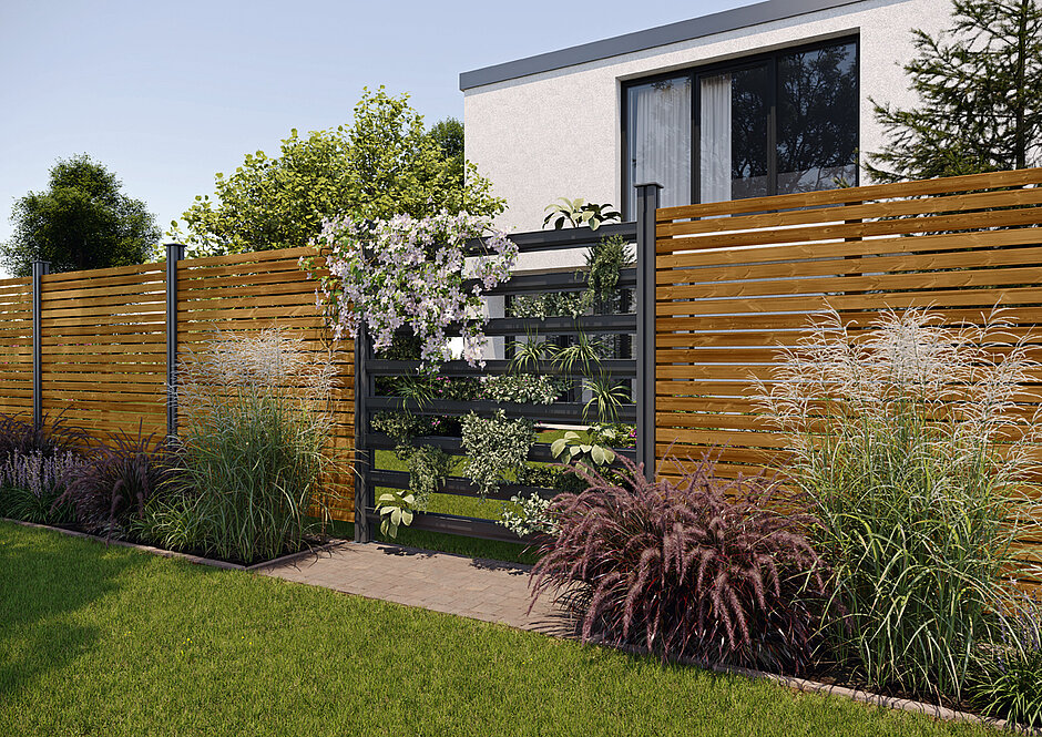 Je nach den baulichen Gegebenheiten und dem persönlichen Geschmack lassen sich mit den witterungsbeständigen, robusten Aluminium-Pflanzrinnen des »Green-Fence«-Systems unterschiedlichste Gestaltungsoptionen realisieren. Denn dank der modularen Bauweise können entweder mehrere Pflanzrinnen freistehend platziert oder aber in bestehende Zaun- und Sichtschutzanlagen integriert werden. Der Abstand ist dabei je nach Platzbedarf und Anzahl der verwendeten »Green-Fence«-Elemente frei wählbar.