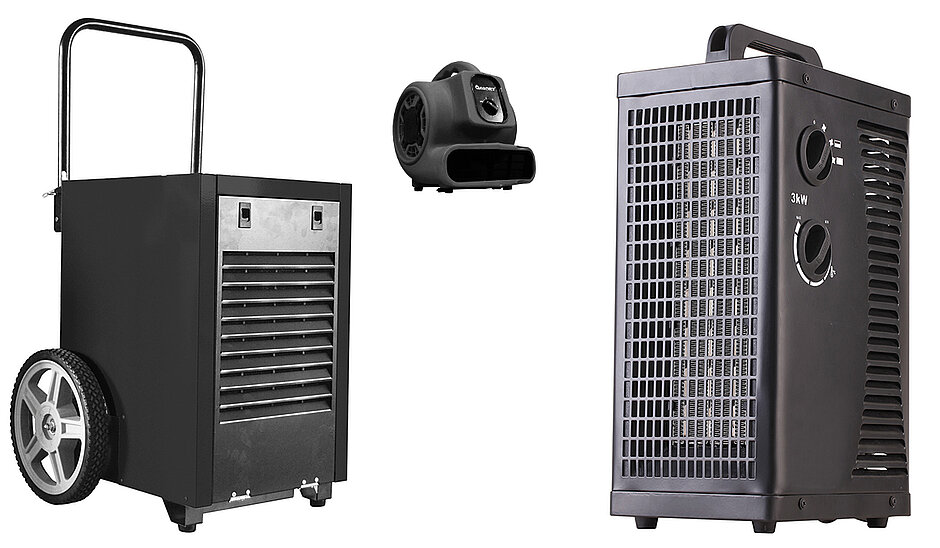 Während die Bautrockner der Luft die Feuchtigkeit entziehen, stellen Ventilator und Radialventilator die Luftzirkulation sicher und tragen damit zur effizienten Trocknung bei. Der Keramikheizstrahler komplettiert das System, indem er die Temperatur erhöht, was die Trocknungsleistung beschleunigt und gleichzeitig für angenehme Arbeitsbedingungen sorgt.