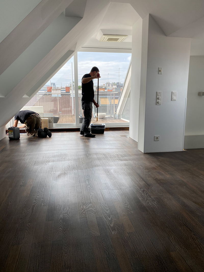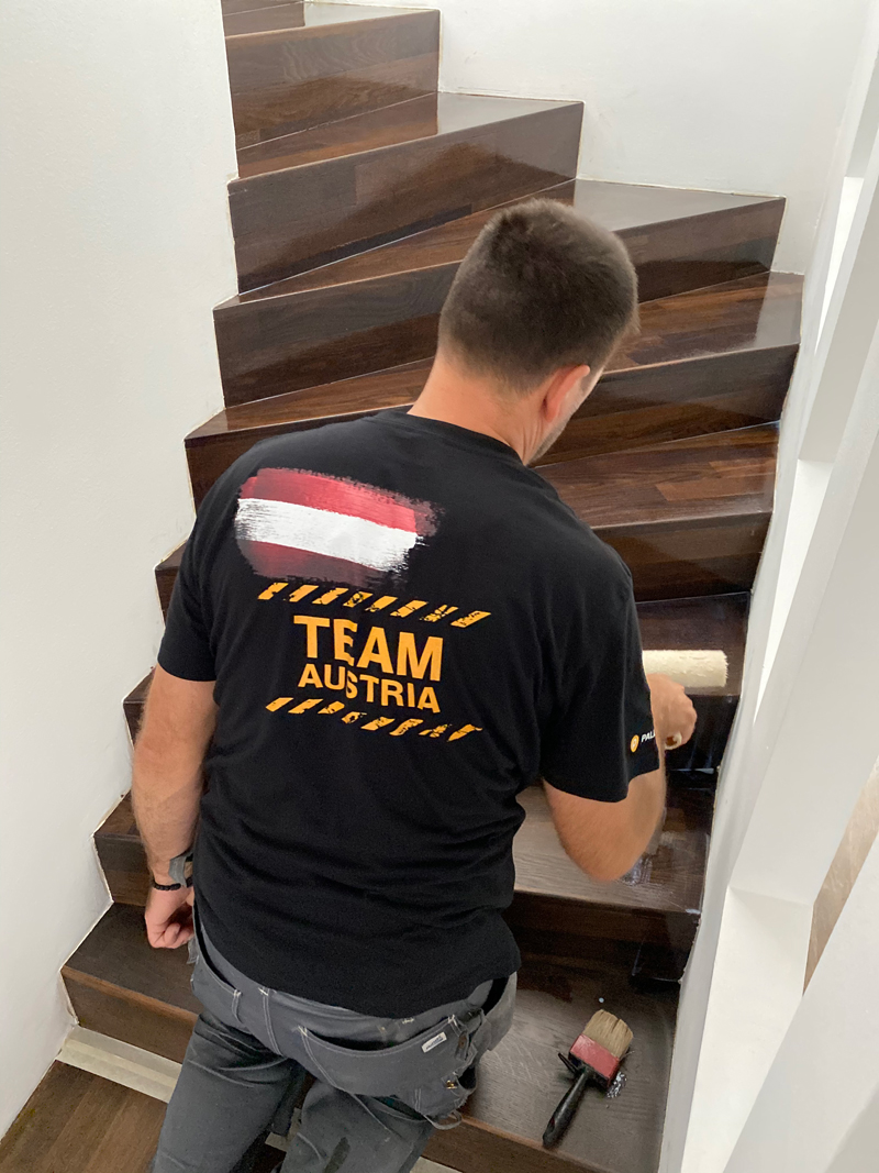Zusammenhalt, Familie und Fleiß, das sind die drei Säulen, auf denen sich der Erfolg der Firma EDEL Bodendesign aus Wien gründet. Vor ca. 15 Jahren kamen Inhaber Darko Škrbić und seine 3 Brüder von Bosnien nach Österreich. Seit 2010 betreiben die 4 gelernten Bodenleger gemeinsam ihren eigenen Handwerksbetrieb. Prinzipiell verlegen und sanieren sie alle Arten von Bodenbelägen. Mittlerweile haben sie sich zunehmend auf Parkett spezialisiert. Ca. 95 % ihrer Aufträge drehen sich um Restaurierung, Neuverlegung und Sanierung von Parkettböden. Dabei vertrauen sie auf die Quali-tätsprodukte von Pallmann. Ihre Kunden akquirieren sie nahezu ausschließlich über Mundpropaganda und durch ihren guten Ruf. Außerdem sind sie vor Ort sehr gut vernetzt: ca. 70 % der Parkettleger in Wien stammen ur-sprünglich vom Balkan. Da kennt man sich untereinander und nicht selten werden Geschäfte bei leckerem Essen oder einem Gläschen besprochen.