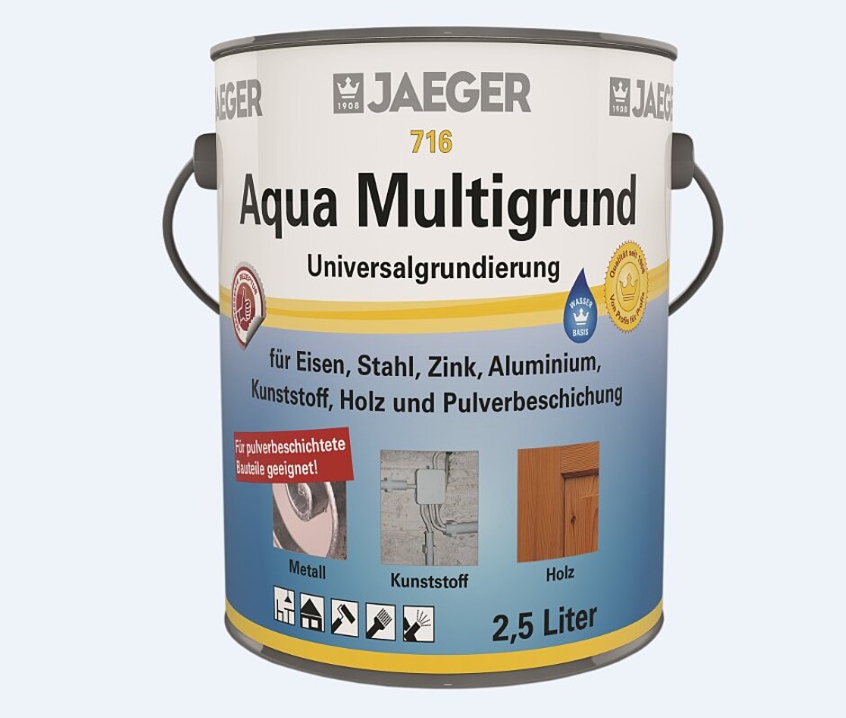 Die Universalgrundierung »Jaeger Aqua Multigrund« kommt ab sofort mit einer verbesserten Rezeptur in den Handel. Ein echter Zusatznutzen ist die Eignung für pulverbeschichtete Oberflächen. Die wasserverdünnbare, weiß pigmentierte Universalgrundierung »Aqua Multigrund« von Jaeger ist für innen und außen geeignet und haftet auf vielen verschiedenen Untergründen. Darüber hinaus ist die Grundierung laut Hersteller wetterbeständig und hitzebeständig bis 80 °C. Ein weiteres Plus ist die schnelle Trocknung, schon nach ca. 6 Stunden können die grundierten Flächen überstrichen werden. Ab sofort kommt die Grundierung mit einer neuen, verbesserten Rezeptur in den Handel und kann jetzt auch auf pulverbeschichteten Bauteilen eingesetzt werden. Der aktive Korrosionsschutz schütze Metalluntergründe zuverlässig und verlängere zudem die Renovierungszyklen.
