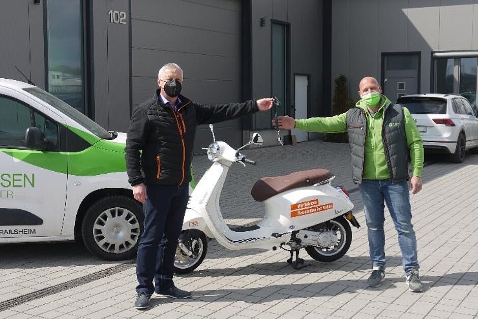 Heiko Schäfer, Inhaber des familiengeführten Fliesenleger-Betriebs Fliesen Schäfer, ist begeisterter Vespa-Fan und freute sich daher riesig über den Hauptgewinn. Am 13.04.2021 wurde die Vespa an den Gewinner übergeben, der ihn für zukünftige Ausflüge ins Umland nutzen wird.