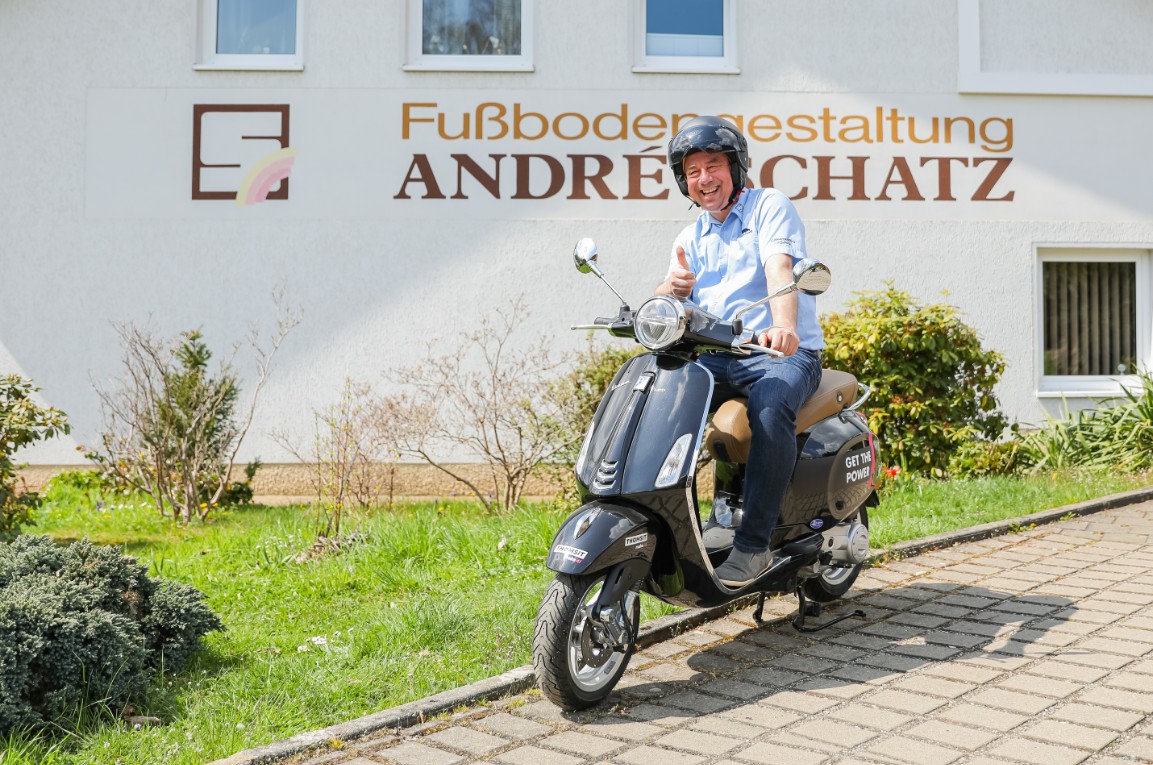 Andre Schatz, Gesellschafter des gleichnamigen familiengeführten Fußboden¬gestaltungsbetriebs, interessiert sich schon seit jeher für Motorroller und freute sich daher riesig über den Hauptgewinn. Am 29.04.2021 wurde die Vespa an den Gewinner übergeben, der ihn sowohl für zukünftige Ausflüge ins Umland als auch für gelegentliche Fahrten zu den Baustellen nutzen wird.