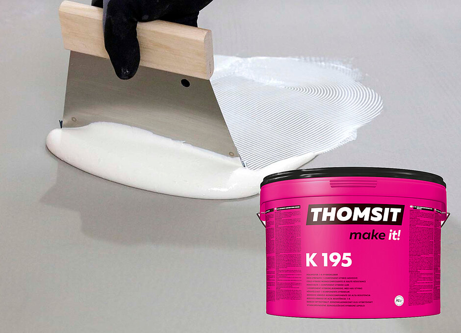 Im Gegensatz zu konventionellen 2-K-PU-Klebern sei der neue SMP-Kleber K 195 kennzeichnungsfrei und punkte mit höherem Gesundheitsschutz bei der Verarbeitung. Ausgezeichnet mit dem EMICODE-Siegel EC1 Plus ist Thomsit K 195 emissionsarm und erfülle höchste Anforderungen an Arbeits-schutz, Raumluftqualität und Umweltverträglichkeit. Die vollkommen dichten Gebinde machen die sonst üblichen Abdeckfolien zum luftdichten Verschluss nicht erforderlich. Das spart Ressourcen und vermeidet Müll.