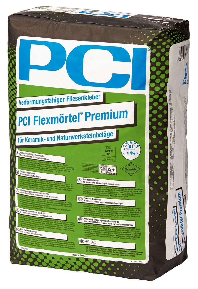 »PCI Flexmörtel Premium« ist laut Herteller sehr emissionsarm nach GEV-EMICODE EC 1 PLUS. Der Kleber entspricht der Klassifizierung C2 FE S1 nach DIN EN 12004 und der Richtlinie »Flexmörtel« der Deutschen Bauchemie e. V.J.