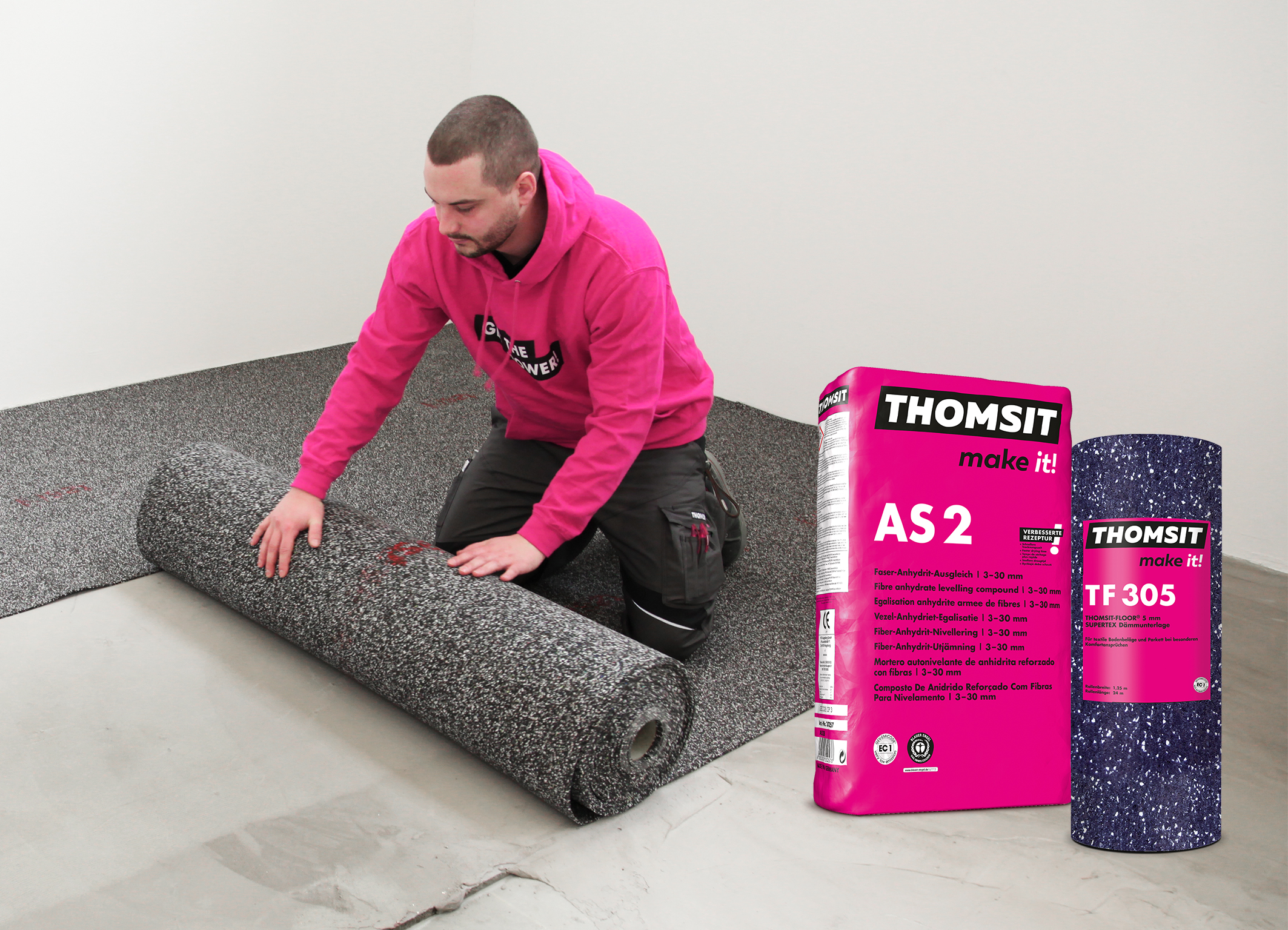 THOMSIT AS 2 ist eine Faser-Anhydrit-Grundierung zum Ausgleichen von 3 - 30 mm in einem Arbeitsgang. Durch die Faserverstärkung werden Risse vermieden und eine nahezu spannungsfreie, glatte Oberfläche erzielt. Die universelle Trittschalldämmung THOMSIT TF 305 hat ein geringes Flächengewicht und sehr gute Wärmedämmungseigenschaften. Dank der geringen Materialdicke von 5 mm ermöglicht sie eine niedrige Aufbauhöhe, was besonders bei der Altbausanierung eine wichtige Anforderung ist. Die selbstklebenden THOMSIT TRD 5 Randdämmstreifen runden das System ab. Sie sind für den Anschlussbereich Boden/Wand vorgesehen und tragen zur Vermeidung von Schallbrücken bei.