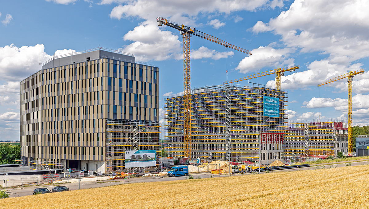 Drei achtgeschossige Bürotürme wachsen derzeit in Ulm in die Höhe. Der »Universelle«, so der Name des markanten Bürokomplexes, wird neuer Bestandteil der Ulmer Wissenschaftsstadt. Hier entwickeln sich in drei Science Parks Gewerbeflächen in unmittelbarer Nähe zur Universität und zu den Hochschulen. Der neue Komplex weist in den drei Türmen, die sich über einem zweigeschossigen Sockel erheben, rund 35 000 m² Bürofläche auf, darunter mehr als 10 000 m² für Labore, Forschung und Entwicklung. Zusätzlich zur guten ÖPNV-Anbindung stehen 500 Tiefgaragen-Stellplätze und weitere 150 Außenstellplätze zur Verfügung.