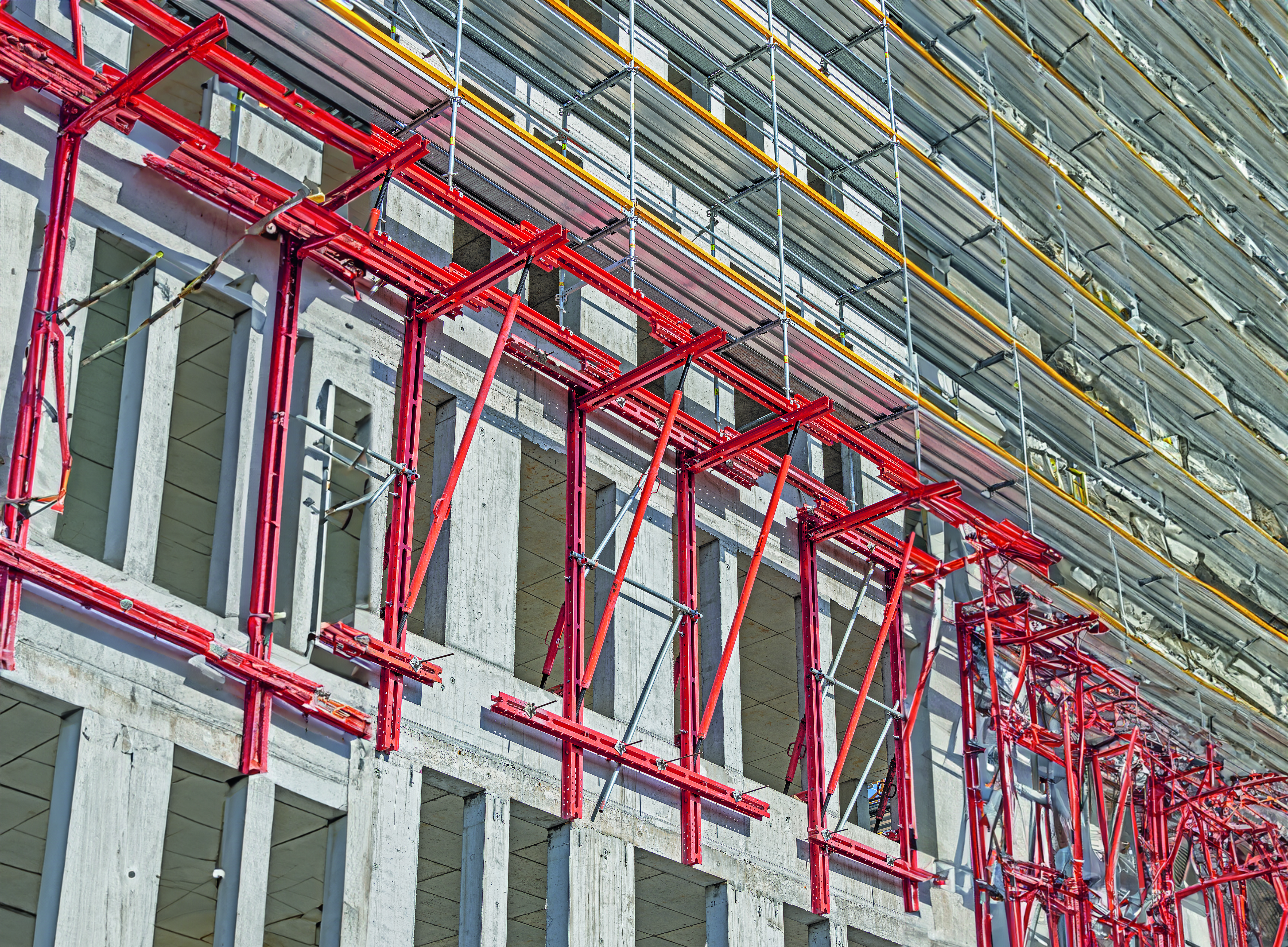 Beide Baukastensysteme, »Peri Up« und »Variokit«, basieren auf einem metrischen Systemraster und lassen sich dadurch problemlos kombinieren. Auch die frühzeitige Synchronisation der Systemlösungen für Gerüstbau und Rohbau ergab wertvolle Vorteile für alle am Bau Beteiligten, denn dadurch konnten alle Interessen vereint und Schnittstellenproblematiken vermieden werden. Vorteile, die sich auch positiv auf das Baustellenergebnis und den Zeitplan auswirken.