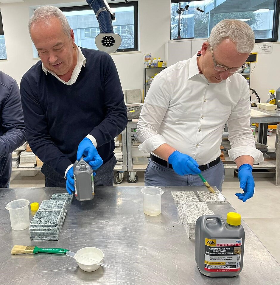 Die Schulungstage in der Fila Academy am Hauptsitz des Unternehmens in San Martino di Lupari unweit von Padua setzen sich zusammen aus einem praktischen Teil über die anzuwendenden Materialien und die verschiedenen Behandlungen, sowie einem theoretischen Teil, in dem die Teilnehmer die wirkungsvollsten Anwendungsweisen der Fila-Systeme kennenlernen. Im praktischen Teil geht es um die Umsetzung von Materialkenntnissen, von der Verlegung von Boden- und Wandbelägen bis hin zum angemessenen Schutz und Pflege, um die Oberflächen bestmöglich zu erhalten.