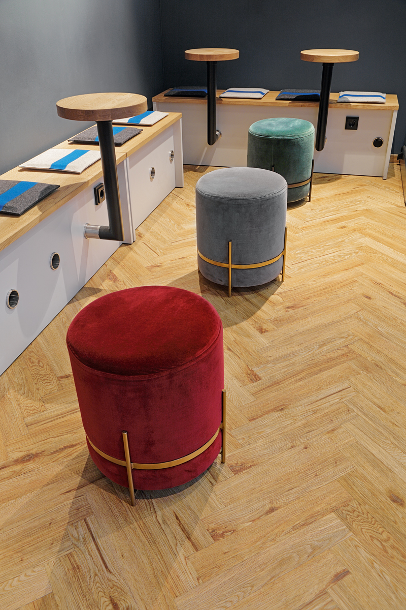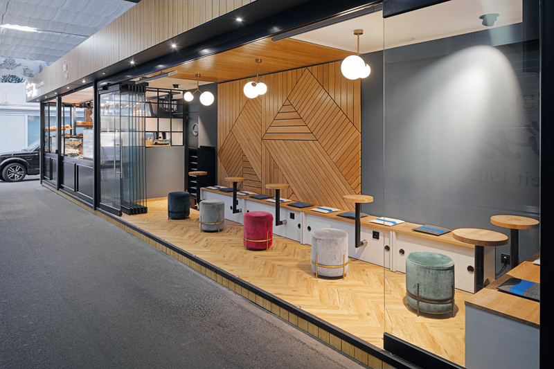 Zum Einsatz kamen mehrere Dekore von Project Floors. Den Gastraum ziert beispielsweise eine Fischgrätverlegung mit dem Dekor »PW 3840«. Die Materialkombinationen und das Farbkonzept sind so gewählt, dass sich das traditionelle Back-Handwerk in einem zeitgemäßen Gewand präsentiert. Die Designverlegung und andere Holzelemente stehen für die traditionellen Werte, das Mobiliar und die schwarzen Akzente geben einen modernen Touch.