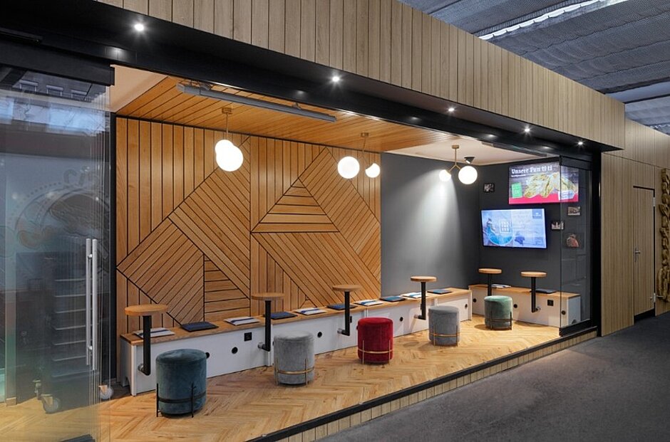 „Das Konzept musste den Kunden umhauen und auf etwas noch nicht Gesehenes oder noch nicht Erbautes zurückgreifen. Ziel war es, eine neue Welt für den Kunden zu erschaffen, in die seine Unternehmens-Philosophie einfließen konnte. Wir wollten eine Verbindung schaffen zwischen ehrlichem Handwerk und frischen Ideen“, so Yannik Lange von KOMIKO. Und es musste zu dem Konzept des Marktplatzes passen.