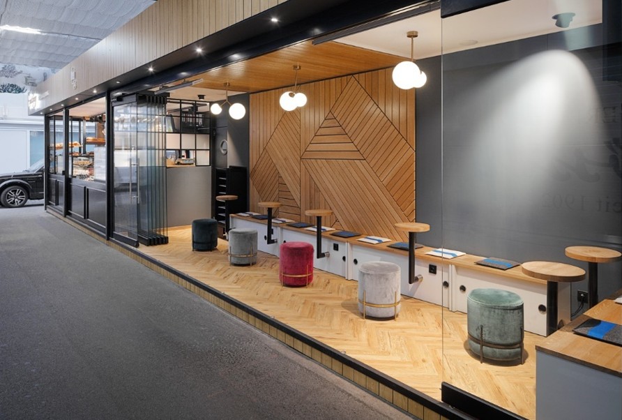 Den Sitzbereich ziert eine Fischgrätverlegung von PROJECT FLOORS mit dem Dekor PW 3840. Die Materialkombinationen und das Farbkonzept sind so gewählt, dass sich das traditionelle Back-Handwerk in einem zeitgemäßen Gewand präsentiert. Die Designverlegung und andere Holzelemente stehen für die traditionelle Werte, das Mobiliar und die schwarzen Akzente geben einen modernen Touch. Der Boden musste zum einen technische Eigenschaften aufweisen wie eine hohe Rutschhemmung, aber in erster Linie musste er als im wahrsten Sinne des Wortes grundlegendes Gestaltungselement in das Gesamtkonzept passen. „Aufgrund eigener und guter Erfahrungen wählten wir erneut PROJECT FLOORS. Die breite Produktpalette bzw. die große Auswahl an Designs überzeugen uns immer wieder und bieten zu jedem Raumkonzept den passenden Boden“, so Yannik Lange abschließend.