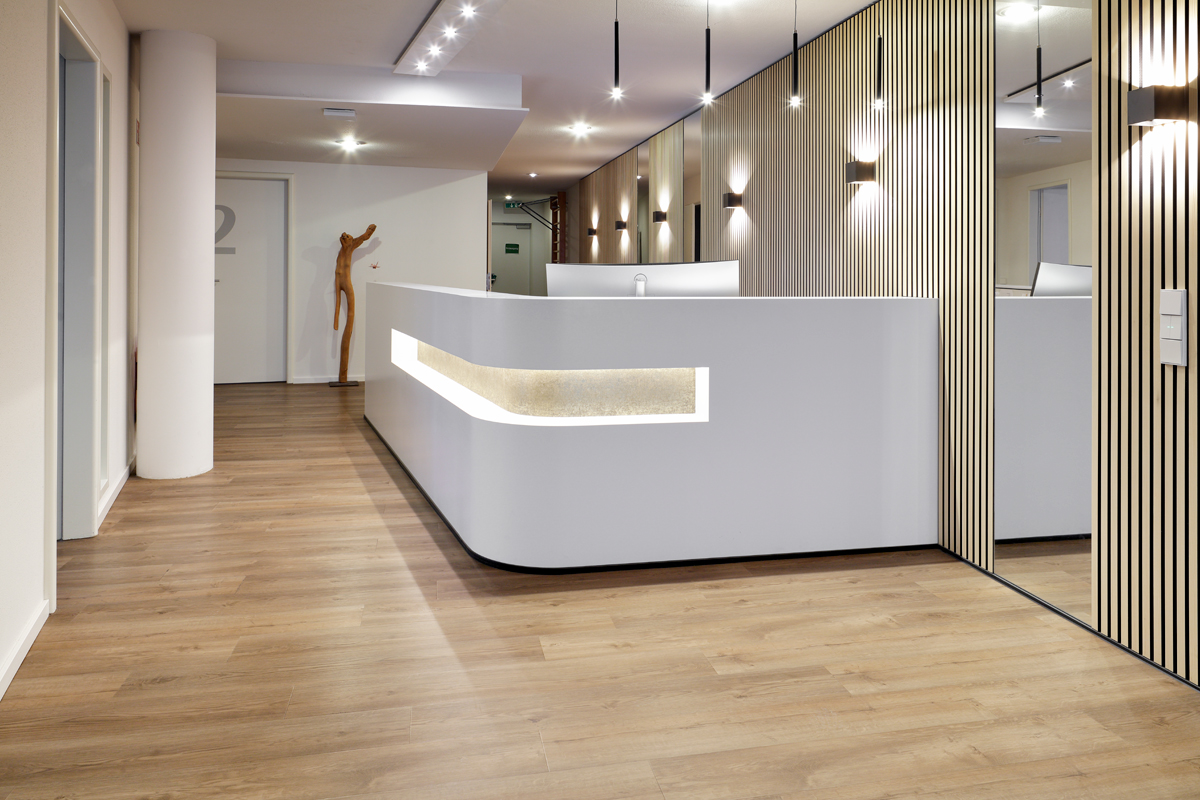 Für die Neugestaltung der Praxisräume wurde die Innenarchitektin Tamara Reiser von der Firma Robert Dauwalter beauftragt. Bei der Gestaltung lag der Fokus auf einer einladenden und zugleich professionellen Atmosphäre. Zum Einsatz kam ein Designboden von Project Floors: das Dekor »PW 3260« aus der »floors@work«-Kollektion. Die authentische Holzoptik des Bodens verleiht den Räumen Wärme und Geborgenheit. Gleichzeitig sorgen lebendige Farbakzente und die Kombination mit klaren Weißtönen für Frische, Struktur und eine moderne, hygienische Anmutung. »Ziel war es, eine Umgebung zu schaffen, die gleichermaßen Professionalität und Gemütlichkeit ausstrahlt«, erklärt die Innenarchitektin. »So fördern wir das Wohlbefinden der Patienten und unterstützen den Heilungsprozess aktiv.« Neben der optischen Wirkung überzeugte auch die funktionale Qualität des Bodens. Der Designbelag ist strapazierfähig, pflegeleicht und damit ideal für den Einsatz im medizinischen Bereich geeignet.