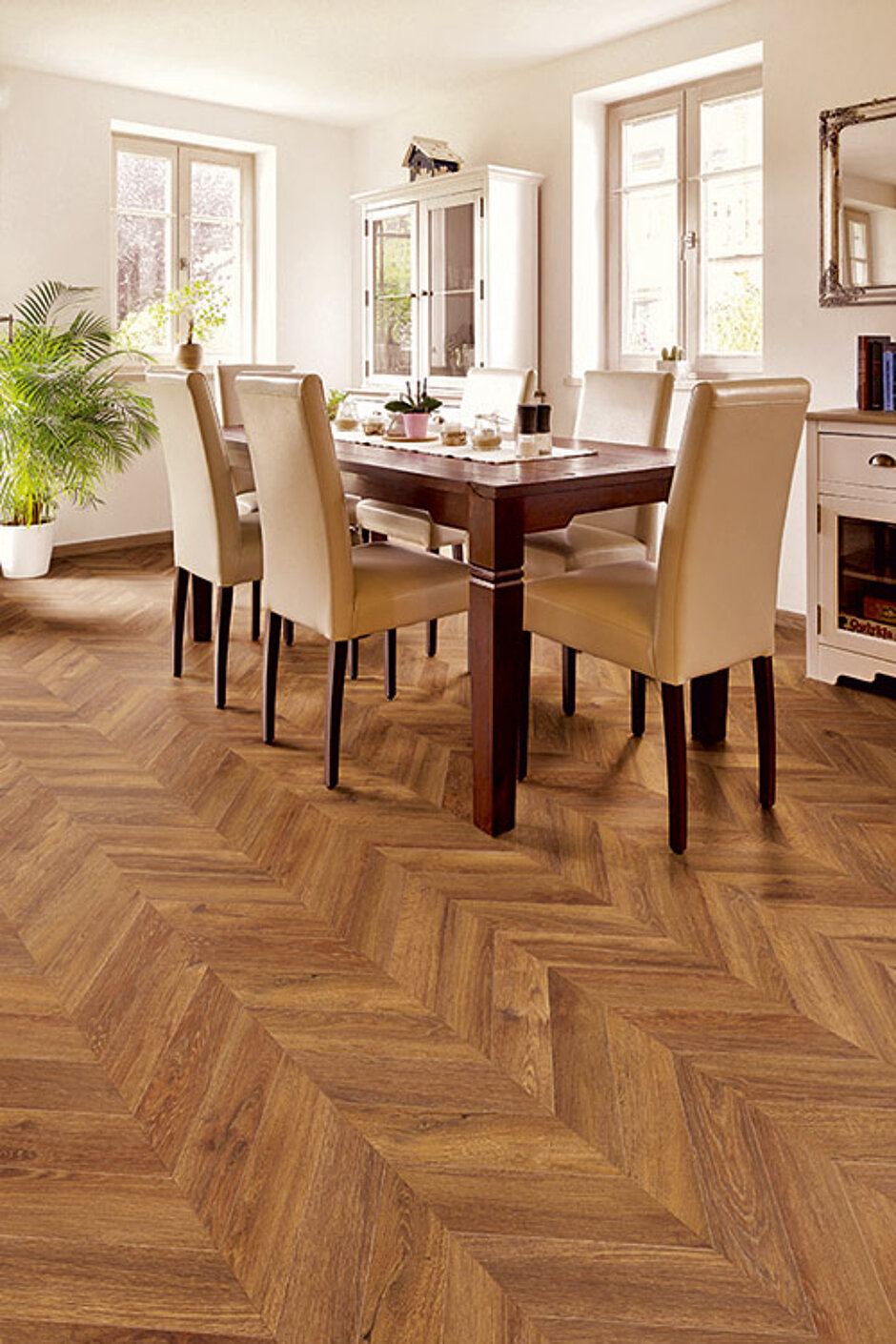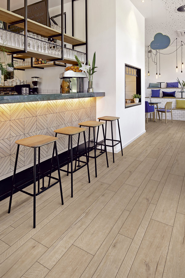 Anspruchsvoll gestaltete Bodenflächen bleiben weiterhin ein großes Thema, dementsprechend erhält die Fischgrät-Kollektion eine Erweiterung durch sechs Dekore im französischen Fischgrätformat (»Chevron«), die in einem Winkel von 60 Grad abgeschrägt sind. So entstehen neue Verlege- und Gestaltungsmöglichkeiten, die an die Parkettböden alter Herrenhäuser des 17. Jahrhunderts erinnern. Nicht weniger innovativ ist die Ausstattung von sechs Dekoren mit einer sogenannten »Grout-Line«-Fase beziehungsweise Profilfase. Um den rustikalen Holzdielen einen besonderen Touch zu geben, wird die Fase dieser in drei Breiten gelieferten Planken (je sechs Planken von jeder Breite pro VE) bis in die Mittellage hineingefräst. Die tiefe Fase und die unterschiedlichen Breiten der Planken schaffen eine besondere Dielencharakteristik, wie man sie laut Hersteller im LVT-Bereich noch nicht gesehen hat.