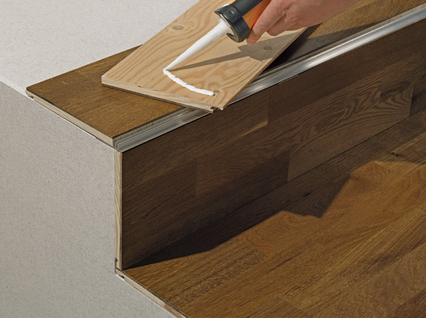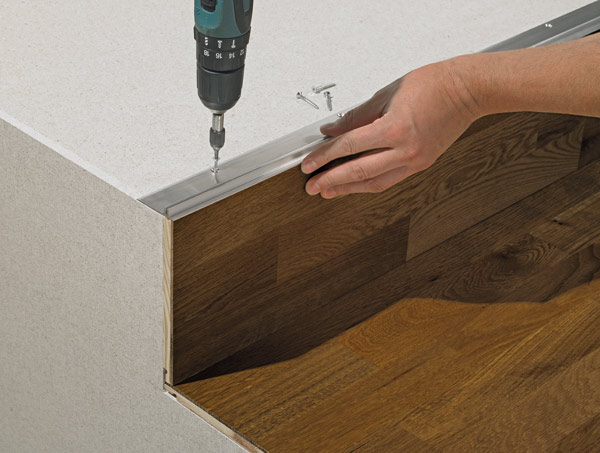 Im vierten Schritt kann nach Überprüfung der Passgenauigkeit der Zuschnitte mit dem Verkleben oder Verschrauben des Basisprofils und der Treppenbeläge begonnen werden.