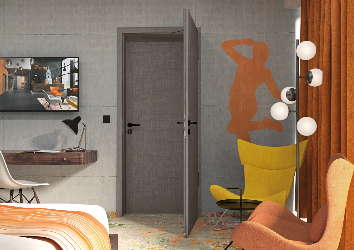 Besonders in Hotelprojekten werden hohe Ansprüche an die Funktionalität, Sicherheit und Qualität der Innentüren gestellt. Zudem müssen sie unterschiedliche Türfunktionen oder Mehrfachfunktionen erfüllen und auch die Ausführung der Türblattkante spielt hier eine zentrale Rolle. Und so hat der Türenhersteller Prüm eine einfache Gesamtlösung für den Kunden bestehend aus Türblatt, Oberfläche, Beschlagausstattung und Türzarge etabliert. Ein Kompletttürangebot von Prüm durch eine BIM (Building Information Modeling) basierte Hoteltürlösung. Ein individuelles und bedarfsgerechtes Paket, das modular aufgebaut ist und doch alle Gestaltungswünsche offenlässt. Dabei sind die Elemente so aufeinander abgestimmt, dass sie ein Höchstmaß an Planungssicherheit für Investoren, Planer und Montagebetriebe bieten. J