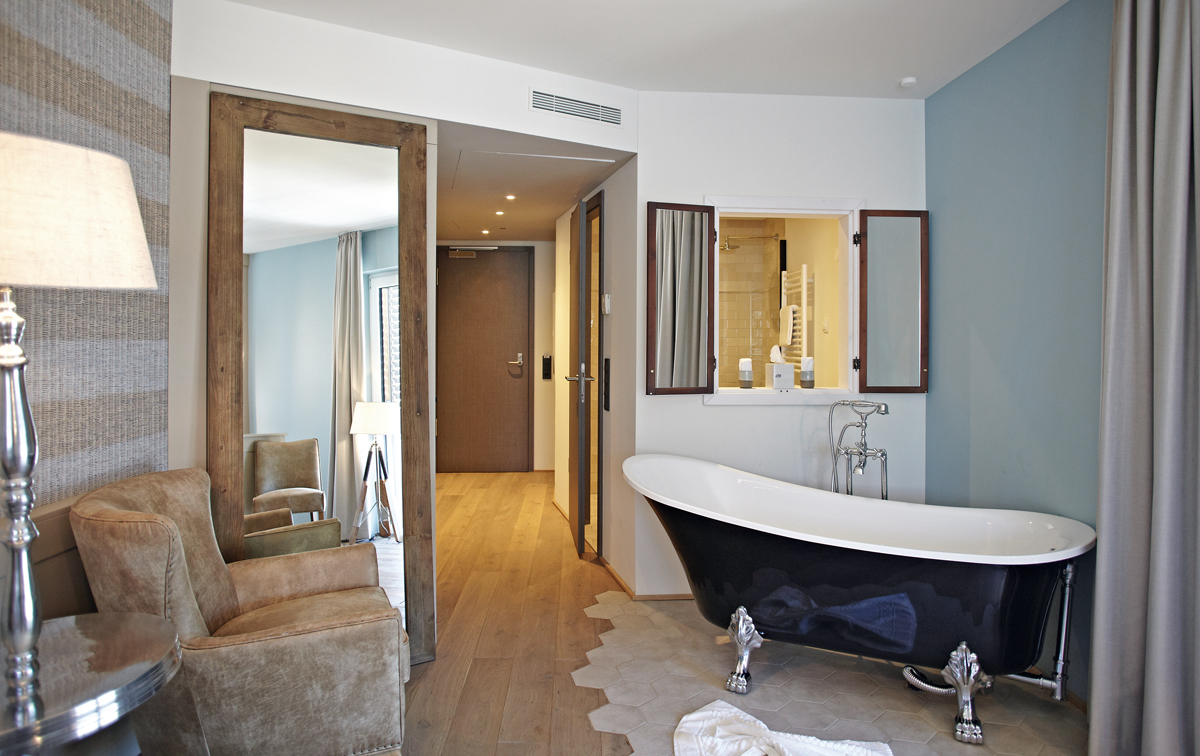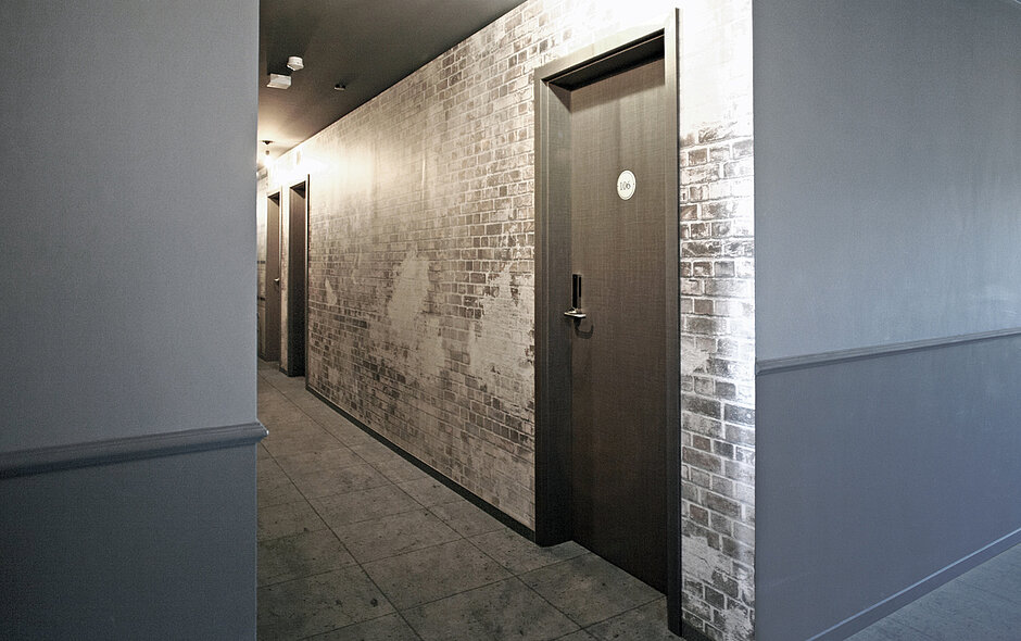 Apropos Türen: Die Vision des Hotelchefs Jan Bolland sah möglichst außergewöhnliche und trendige Türen vor, die sich als Ergänzung in das jeweilige Etagenkonzept einbinden lassen sollten. Gleichzeitig sollten sie aber auch dem rauen Hotelalltag mühelos standhalten. Das passende Türmodell wurde beim Türenhersteller Prüm gefunden. So legte man sich für die Hotelzimmertüren auf die Schallschutztür Typ »HSD-43/SK3« sowie Feuchtraumtüren aus der »CPL Karo« Kollektion fest – inklusive der 2 mm starken Premiumkante.