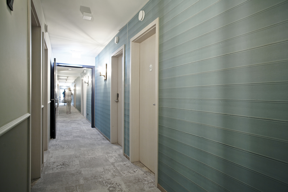 Zudem kamen alle vier »CPL Karo«-Oberflächen: »Dark«, »Beige«, »Grey« und »White« zum Einsatz. Die retroorientierten, modernen Türen, mit einem Wechselspiel aus weiß-schimmernder Karostruktur, fügen sich sehr gestalterisch in den jeweiligen »Etagen-Spirit« ein. Und damit keine Kompromisse bei der Farbauswahl gemacht werden mussten, wurden einige Türen an Falz- und Aufdeckseite mit unterschiedlichen »CPL Karo« Oberflächen ausgeführt.