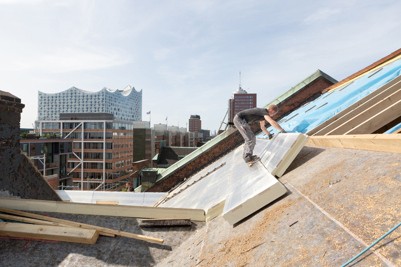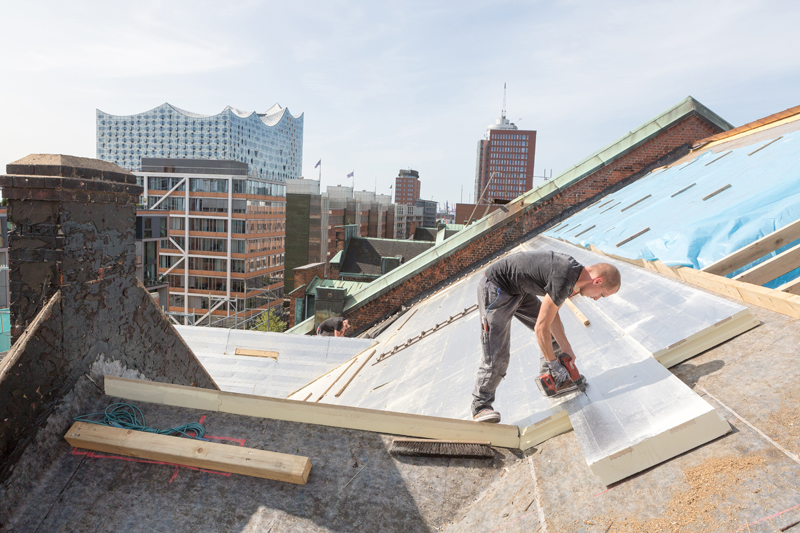 Mit 1100 m² Dachfläche ist der dreiseitig freie Speicher eine Herausforderung. Soll die große Fläche bestmöglich genutzt werden, gehört eine gute Dämmung des Daches dazu. Weil Dämmungen bei den ausgedehnten Dachlandschaften ursprünglich nicht vorgesehen waren, sollten die hier eingesetzten Dämmstoffe möglichst schlank und besonders leistungsfähig sein. Es sind vor allem PU-Dämmungen, die mit Lambda-Werten um 0,022 W/(mK) bei sehr guten Dämmwerten immer noch recht schlank ausfallen. Das hier eingesetzte Dämmelement puren MetalFix ist 120 mm dick, schafft mit der bereits vorhandenen Holzschalung einen U-Wert von unter 0,2 W/(mK) und entspricht damit den Forderungen der EnEV bzw. künftig dem neuen Gebäudeenergiegesetz (GEG).
