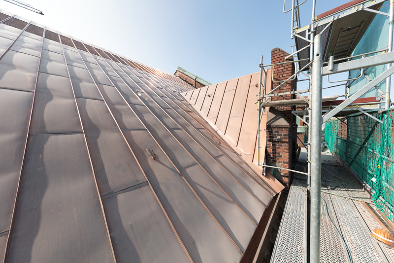 Die Dämmelemente haben oberseitig unter der Alubeschichtung zwei 110 mm breite und 22 mm dicke Befestigungsleisten integriert. Über diese Befestigungsleisten werden die Elemente mit den Dachsparren verschraubt. In den gleichen Leisten finden später aber auch die Kupferscharen der neuen Dachdeckung direkten Halt. Die Lösung mit einer in die Dämmplatte eingelassenen Unterkonstruktion ist sehr schlank und platzsparend, sodass der gesamte Dachaufbau oberhalb der Sparren mit Brettschalung, Dampfsperre, Dämmung, Unterdeckung und Kupferdeckung nur gut 15 cm hoch aufbaut.