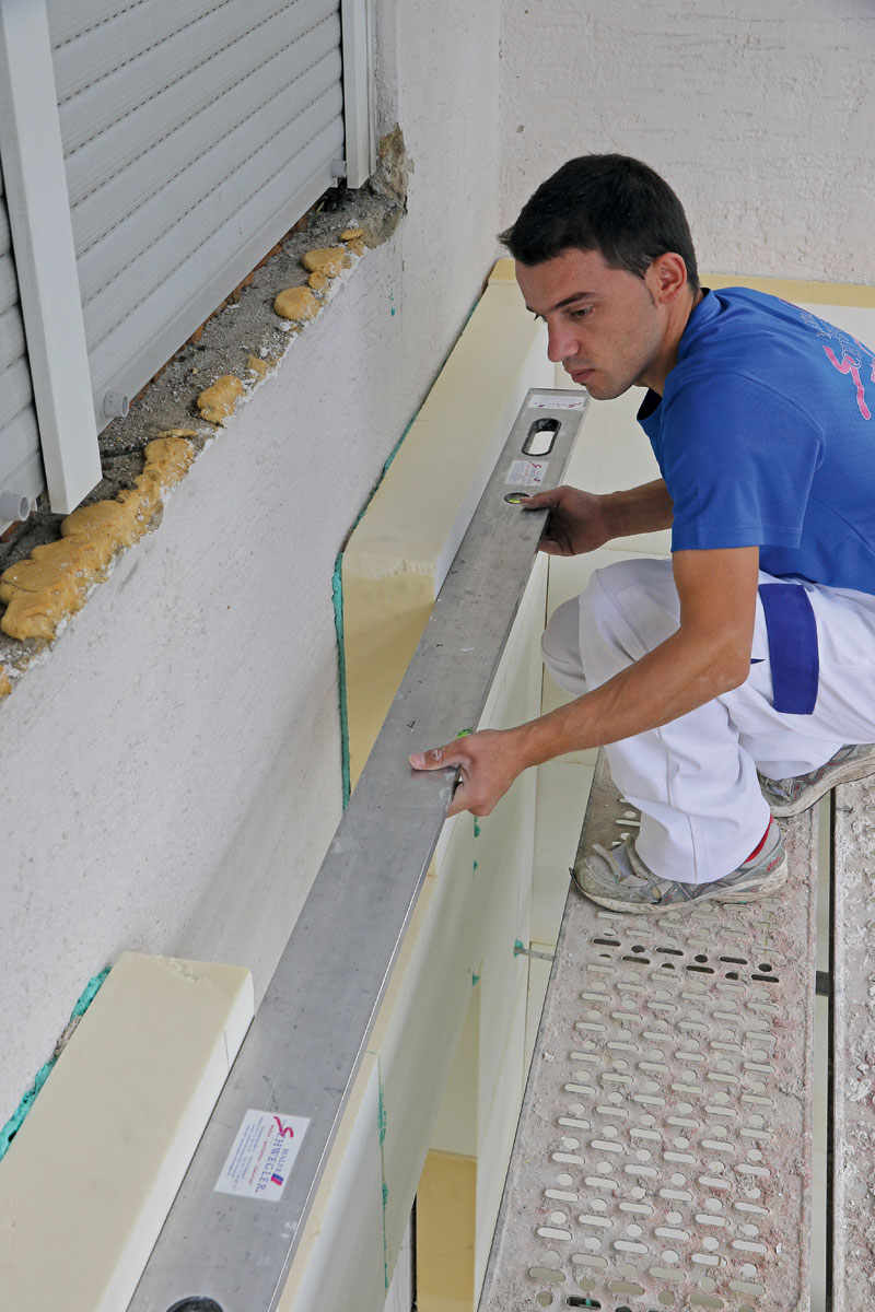 Während Mineralwolle einen Lambda-Wert von nur 0,040 bis 0,050 W/(mK) bietet und EPS zwischen 0,034 bis 0,032 W/(mK) liegt, schafft »purenotherm« mit einem Lambda bis zu 0,024 W/(mK) neue Dämmwelten. Eine so gute Dämmung erlaube schlankere Konstruktionen, die im Fall von engen Bebauungen, Durchfahrten, Gauben oder Giebelwänden unter schmalen Dachüberständen eine Lösung böten, so Bernhard Theis, Verkaufsleiter WDVS beim Systemlieferanten Meffert. Statt 20 cm dicker Dämmungen sind es mit PU nur 12 cm. Nach der Sanierung eines vorherigen Objektes wurden bei Streiflicht Unebenheiten in der Fassade sichtbar. Für Dirk Schwegler vom verarbeitenden Handwerksbetrieb war das PU-WDV-System die richtige Wahl: »Den Aufwand, den man heute bei der Verarbeitung von A1-WDV-Systemen betreiben muss, wollen die Kunden nicht wirklich bezahlen. Ich würde am liebsten nur noch PU-Systeme verarbeiten, denn die Platten sind viel dünner und leichter.« J