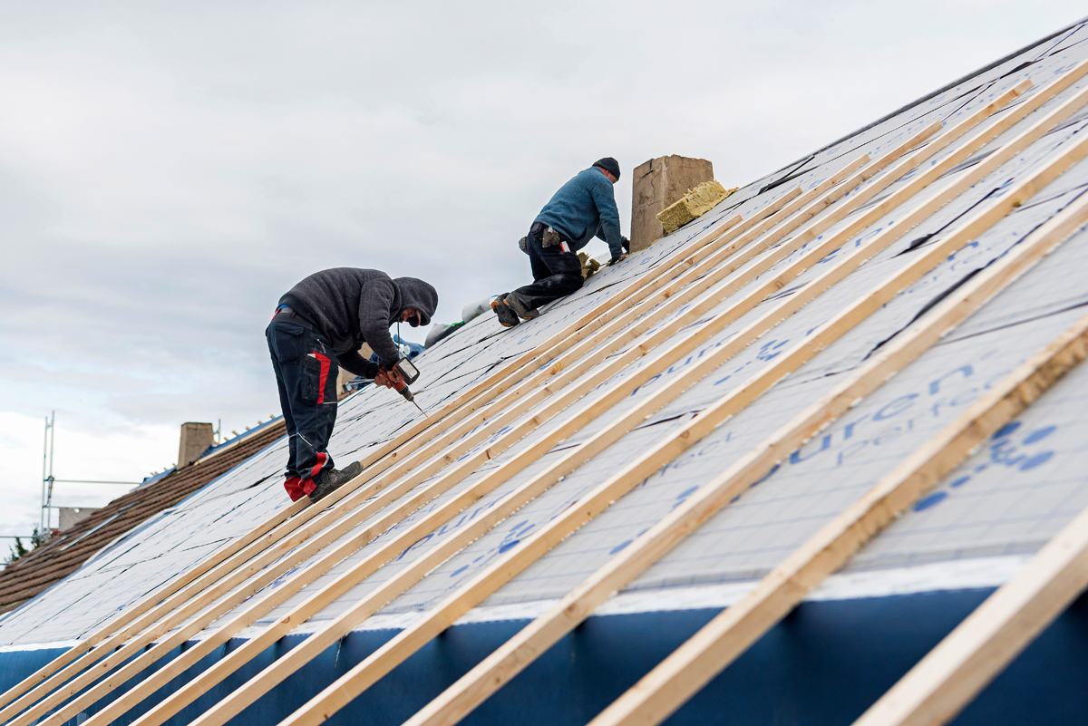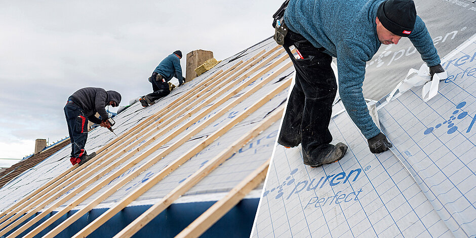 Nach dem Einrüsten der Gebäude sowie der Stellung des firmeneigenen Krans zur schnellen Bereitstellung des benötigten Materials begannen die Fachhandwerker mit dem Rückbau. Dazu entfernten sie abschnittsweise die vorhandene Deckung samt Traglattung von den 28 Grad geneigten Satteldachflächen. Direkt im Anschluss daran verlegten die Zimmerleute die robuste und mechanisch stark belastbare Konvektionssperre »puren TOP DSB 100«. Im Nahtbereich sind die Bahnen zur Fügung mit einem »Kleber-auf-Kleber-System« ausgerüstet. Es sorgt für eine dauerhaft luftdichte Verbindung der Bahnen untereinander und verhindert sowohl das Eindringen von Insekten als auch Feuchtewanderung durch Kapillare. Als schlagregensichere Vordeckung boten die blendfreien Bahnen mit einem sd-Wert von ≥ 100 m ausreichenden Witterungsschutz für die darunterliegende Konstruktion, bis im nächsten Arbeitsschritt die Wärmedämmung aufgebracht wurde.
